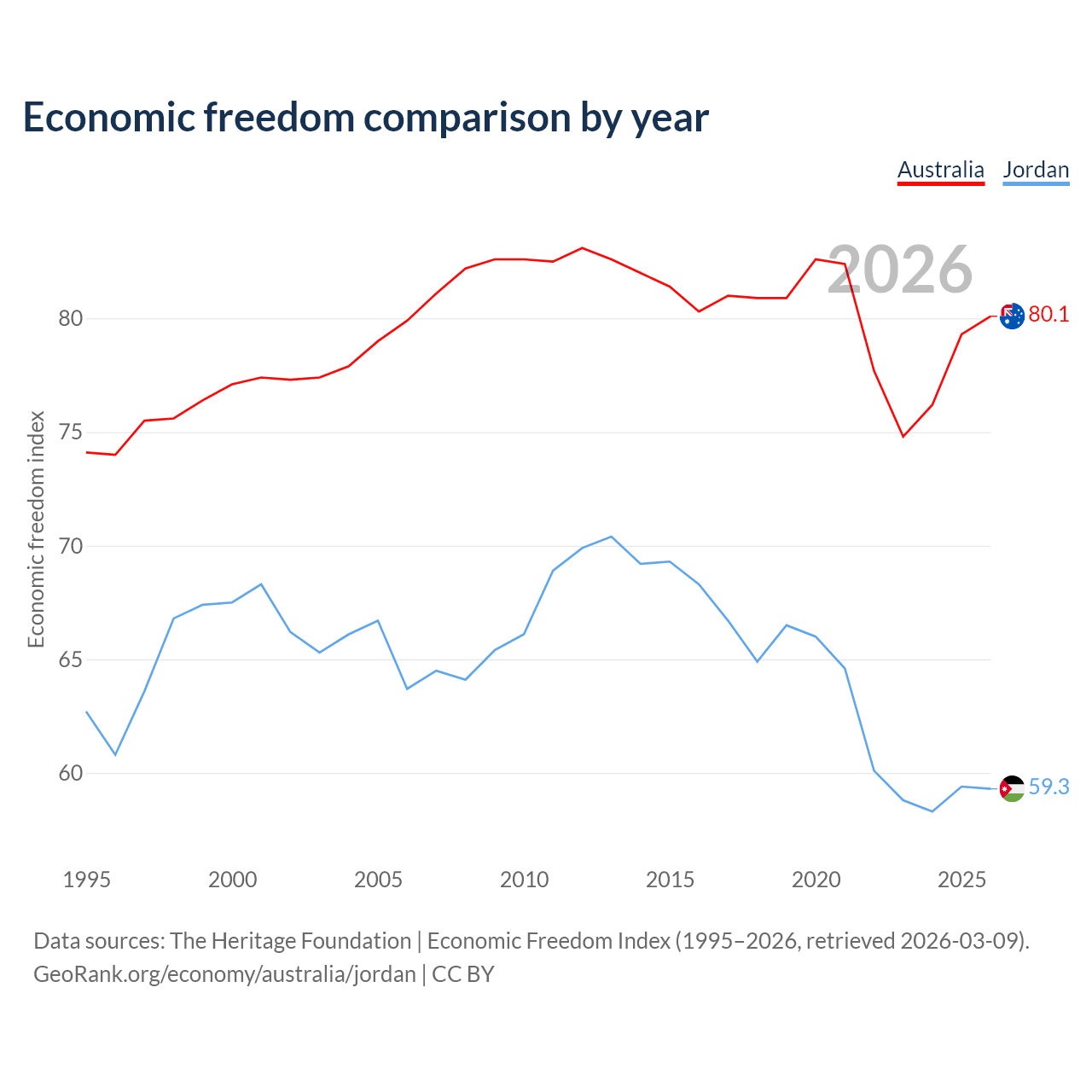 The Economic Freedom Index for Australia is 80.1, ranking 5/197, compared to 59.3 for Jordan, ranking 104/197. The chart above displays a comparison of annual changes in economic freedom indexes.