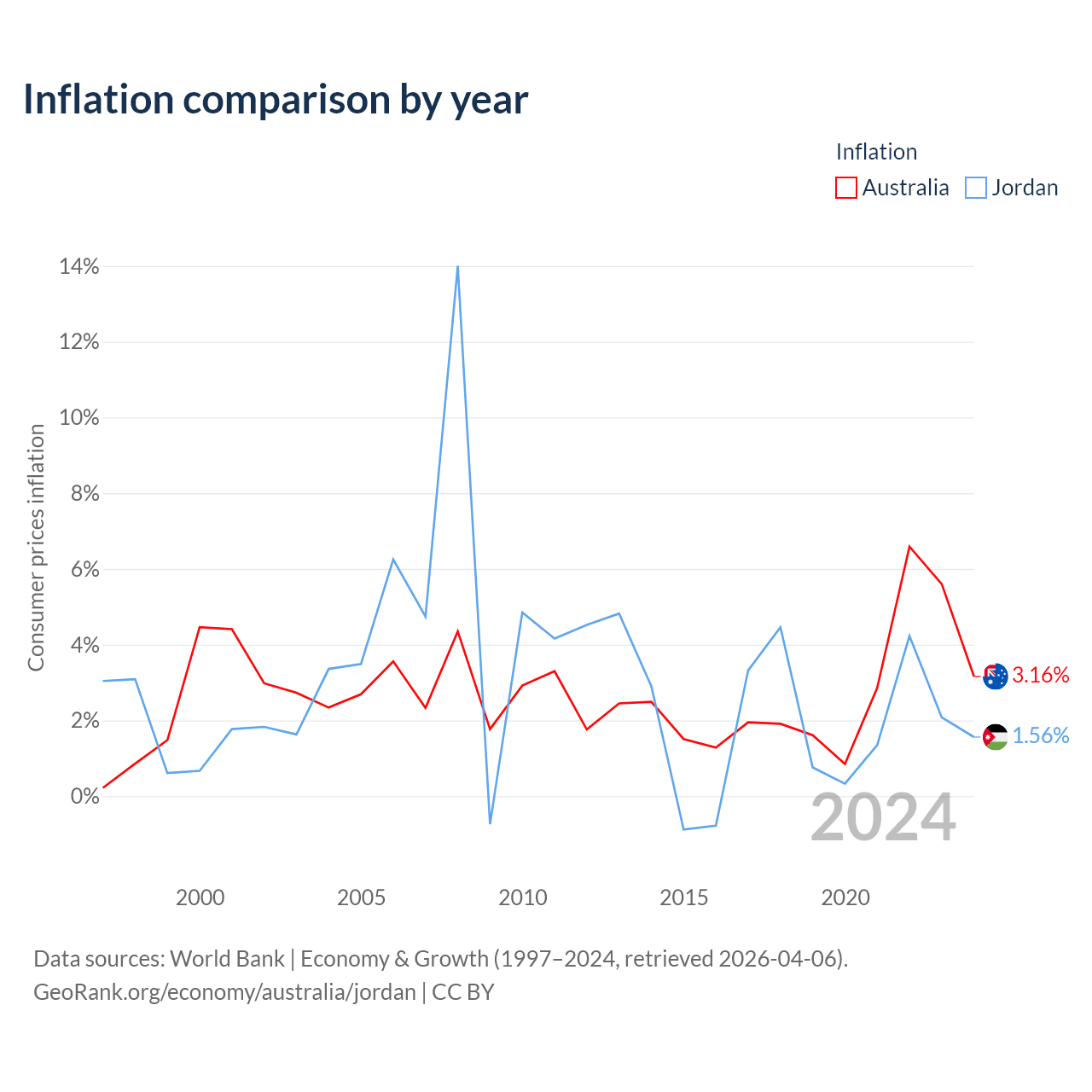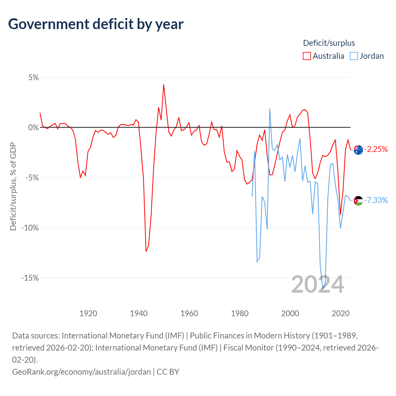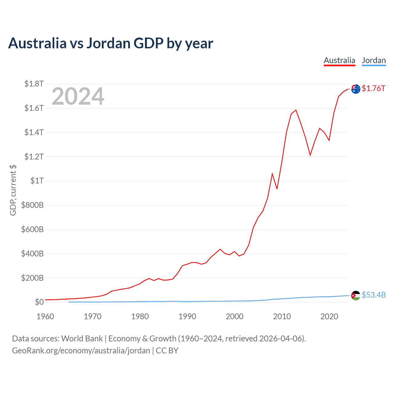 Australia has a GDP of $1.76T compared to $53.4B for Jordan, ranking 14/197 and 90/197 by economy size, respectively.