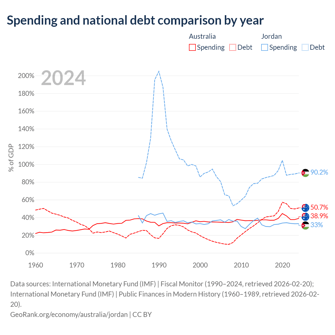 Australia has $891B in government debt (50.7% of GDP), compared to $48.1B (90.2% of GDP) in Jordan.