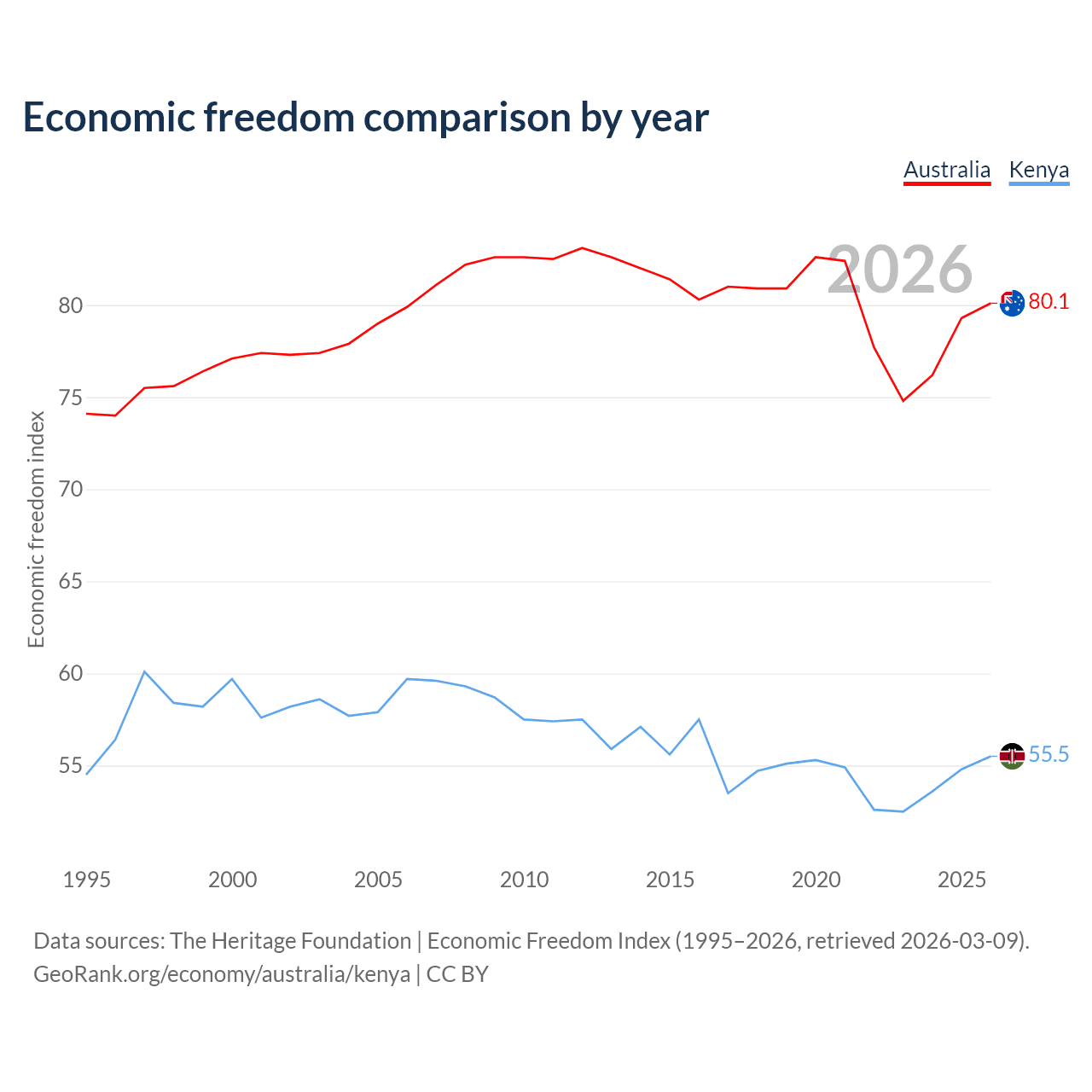 The Economic Freedom Index for Australia is 80.1, ranking 5/197, compared to 55.5 for Kenya, ranking 128/197. The chart above displays a comparison of annual changes in economic freedom indexes.