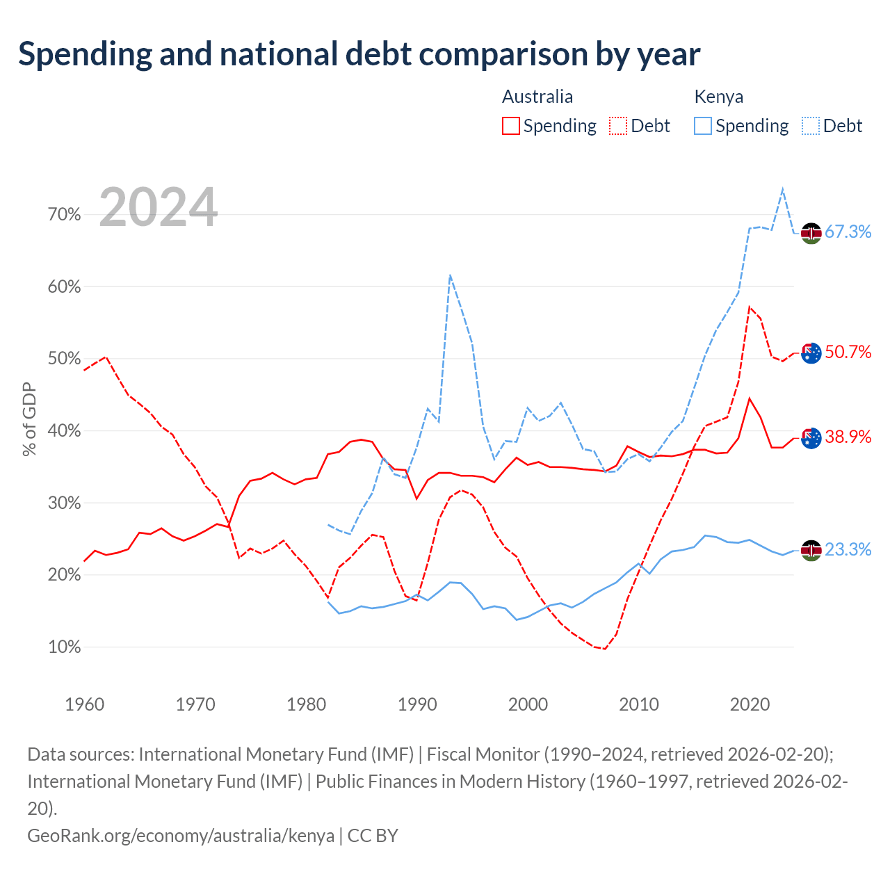 Australia has $891B in government debt (50.7% of GDP), compared to $81B (67.3% of GDP) in Kenya.