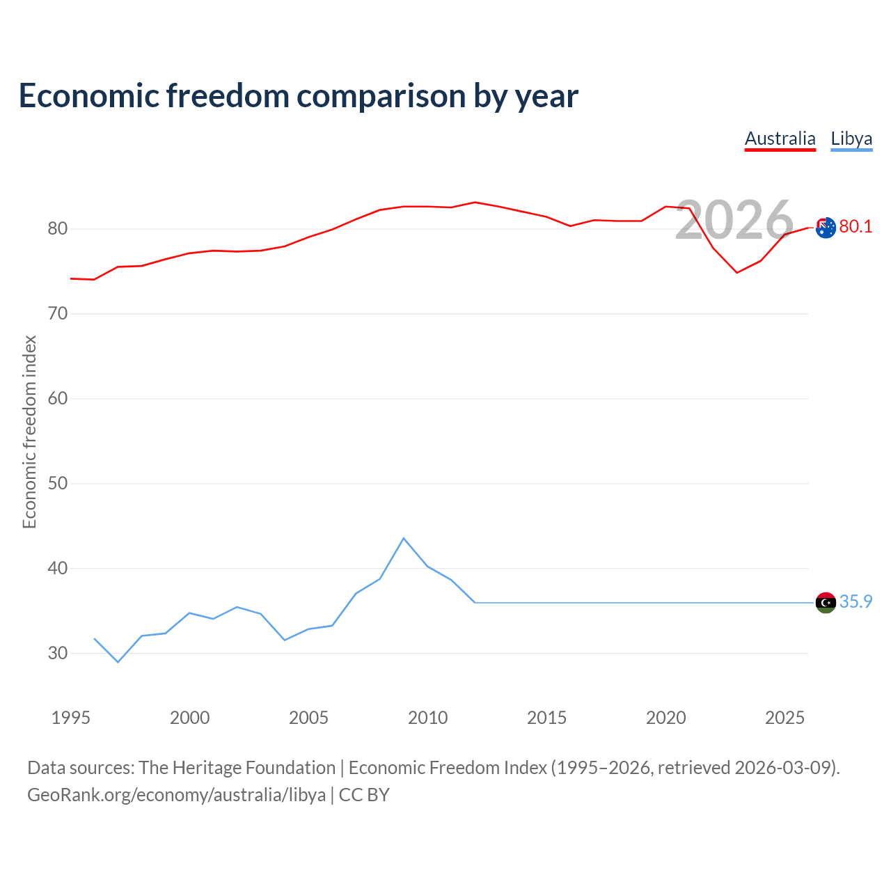 The Economic Freedom Index for Australia is 80.1, ranking 5/197, compared to 35.9 for Libya, ranking 189/197. The chart above displays a comparison of annual changes in economic freedom indexes.