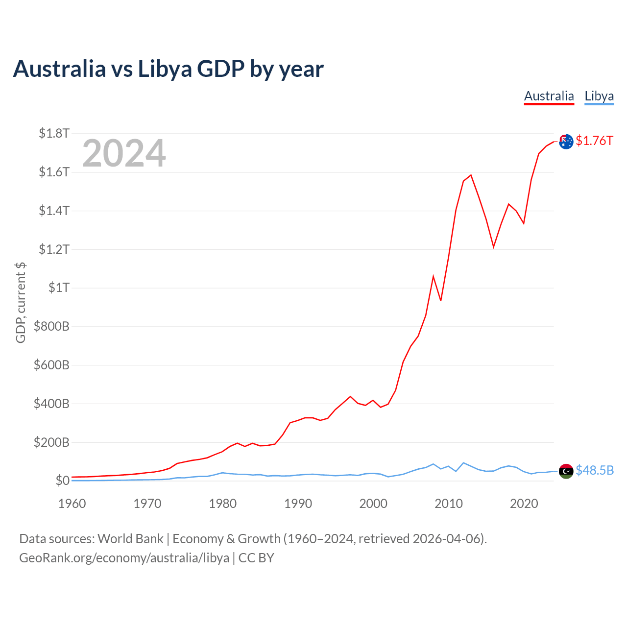 Australia has a GDP of $1.76T compared to $48.5B for Libya, ranking 14/197 and 95/197 by economy size, respectively.