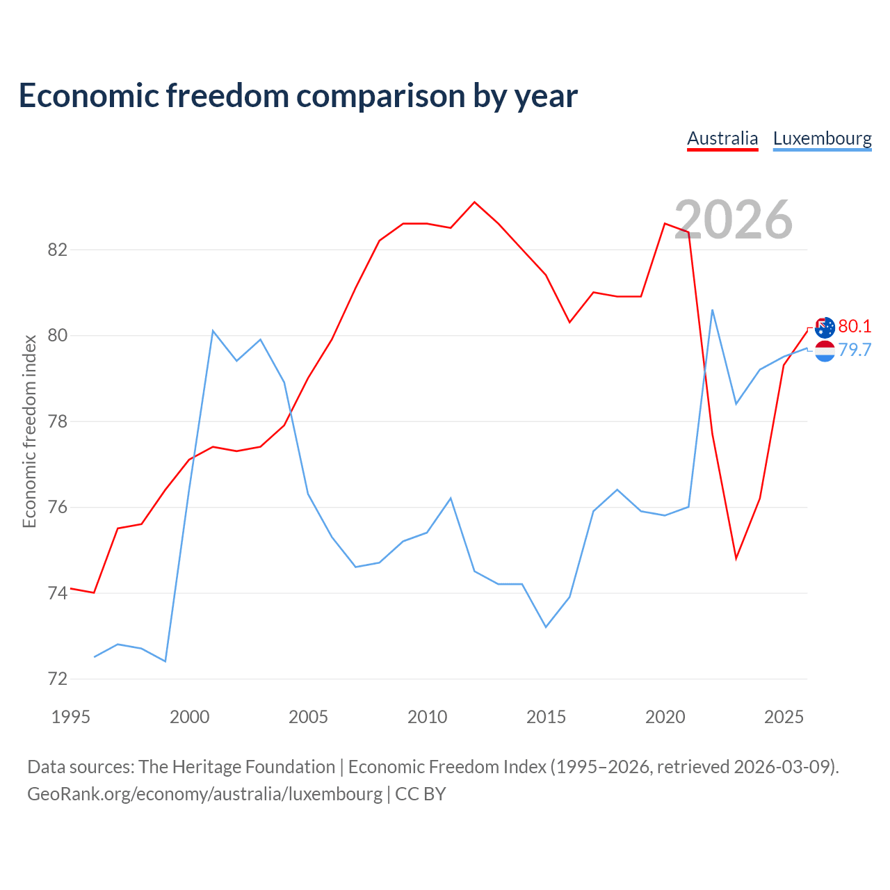 The Economic Freedom Index for Australia is 80.1, ranking 5/197, compared to 79.7 for Luxembourg, ranking 7/197. The chart above displays a comparison of annual changes in economic freedom indexes.