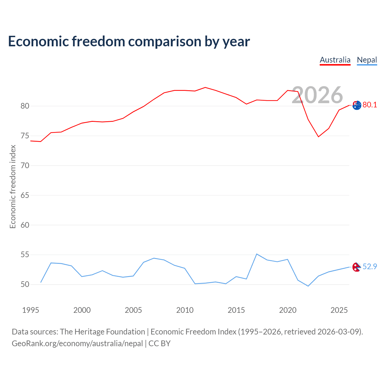 The Economic Freedom Index for Australia is 80.1, ranking 5/197, compared to 52.9 for Nepal, ranking 144/197. The chart above displays a comparison of annual changes in economic freedom indexes.