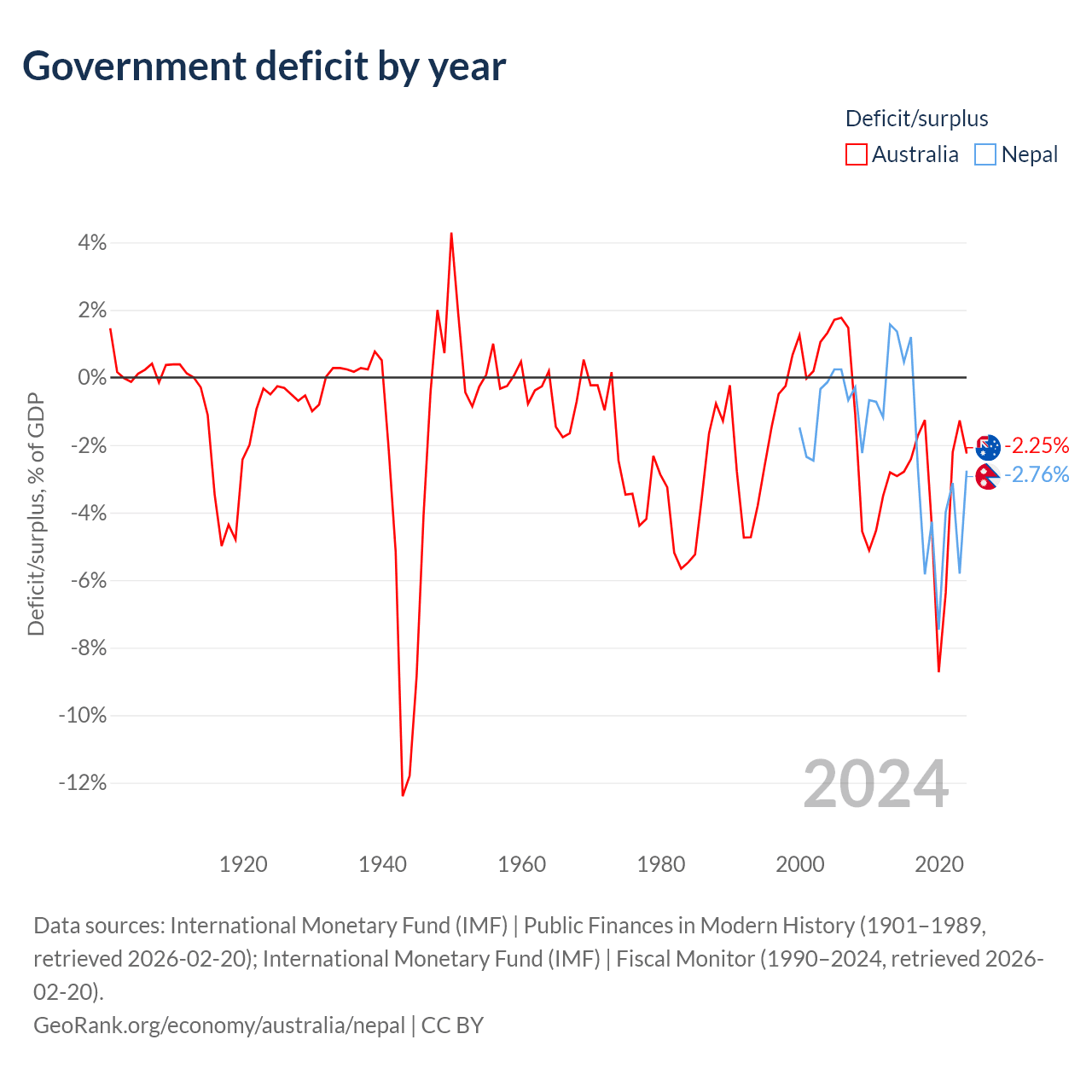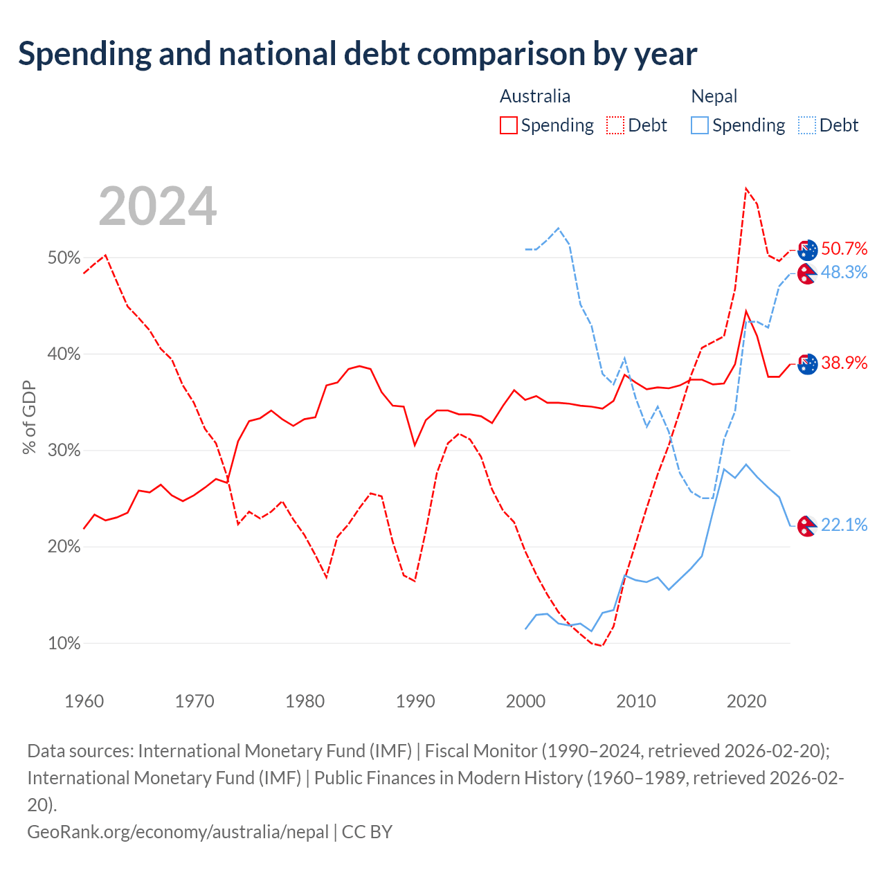Australia has $891B in government debt (50.7% of GDP), compared to $20.7B (48.3% of GDP) in Nepal.