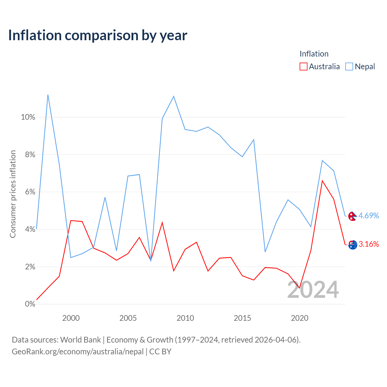 Australia has a GDP of $1.76T compared to $42.9B for Nepal, ranking 14/197 and 101/197 by economy size, respectively.