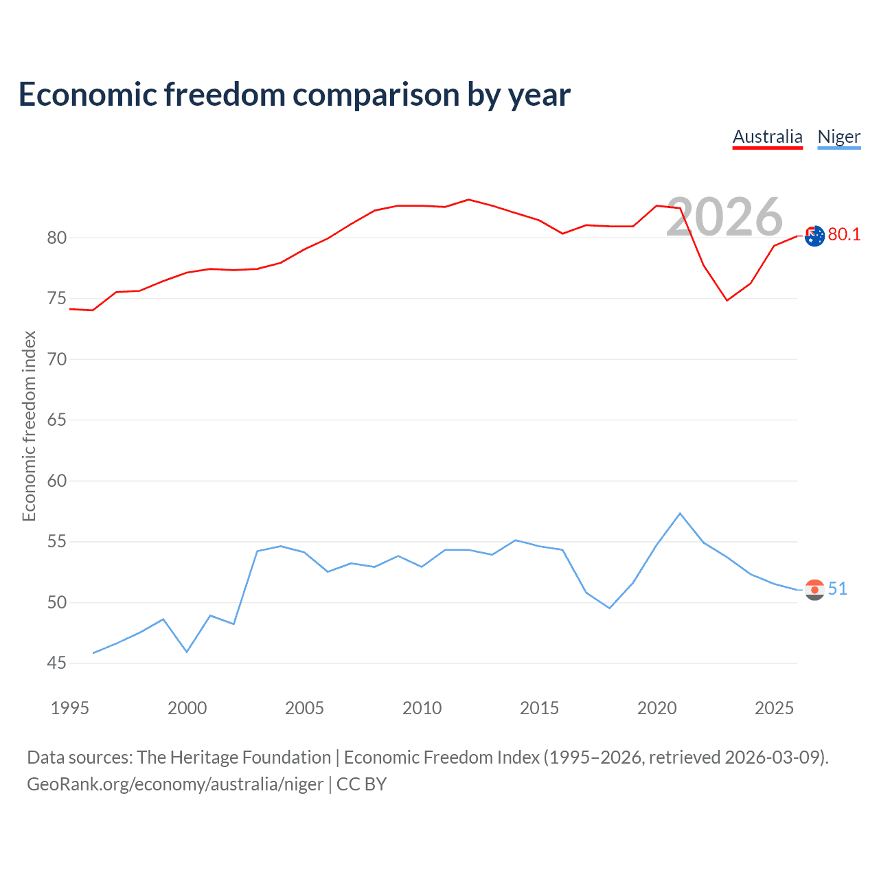 The Economic Freedom Index for Australia is 80.1, ranking 5/197, compared to 51 for Niger, ranking 156/197. The chart above displays a comparison of annual changes in economic freedom indexes.