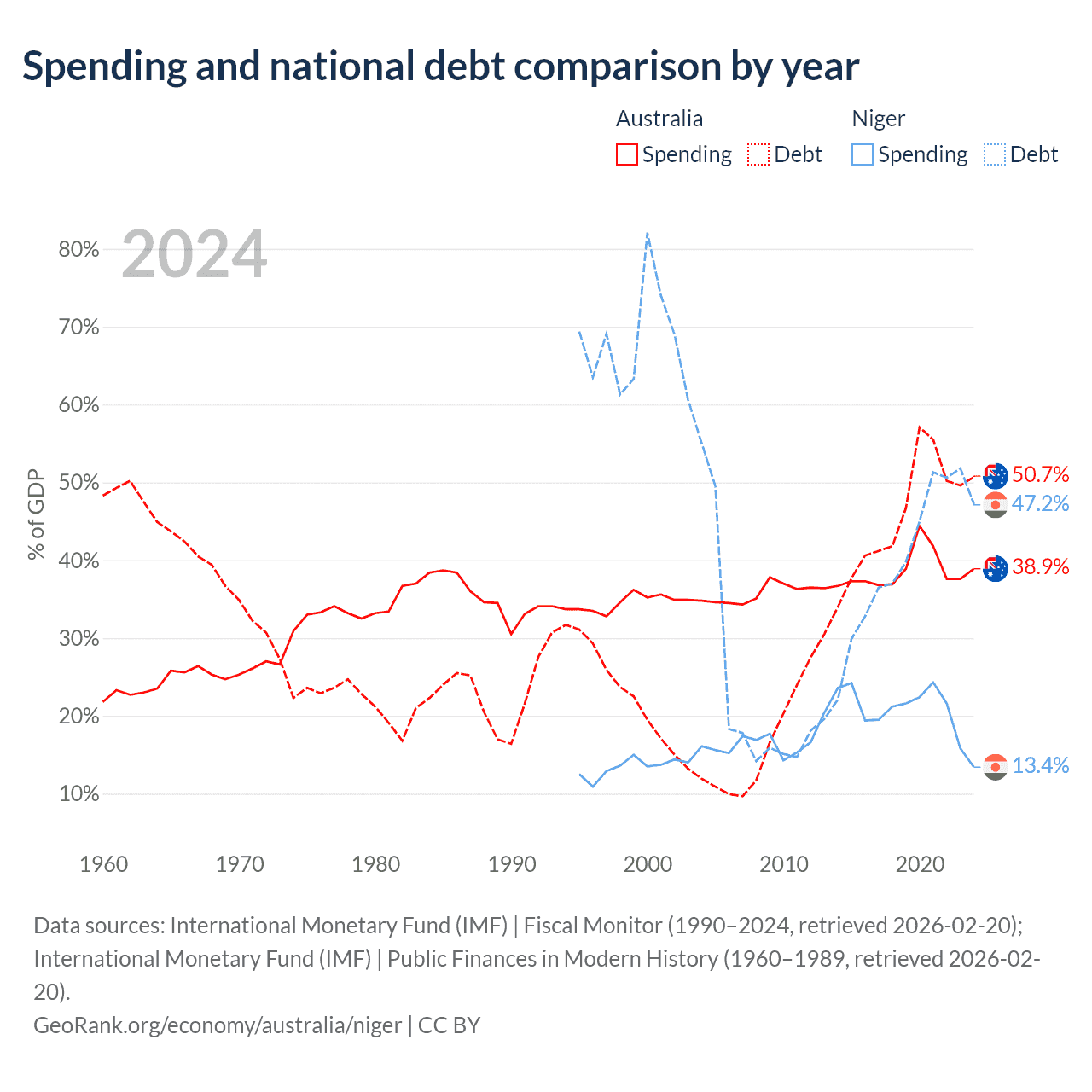 Australia has $891B in government debt (50.7% of GDP), compared to $9.39B (47.2% of GDP) in Niger.
