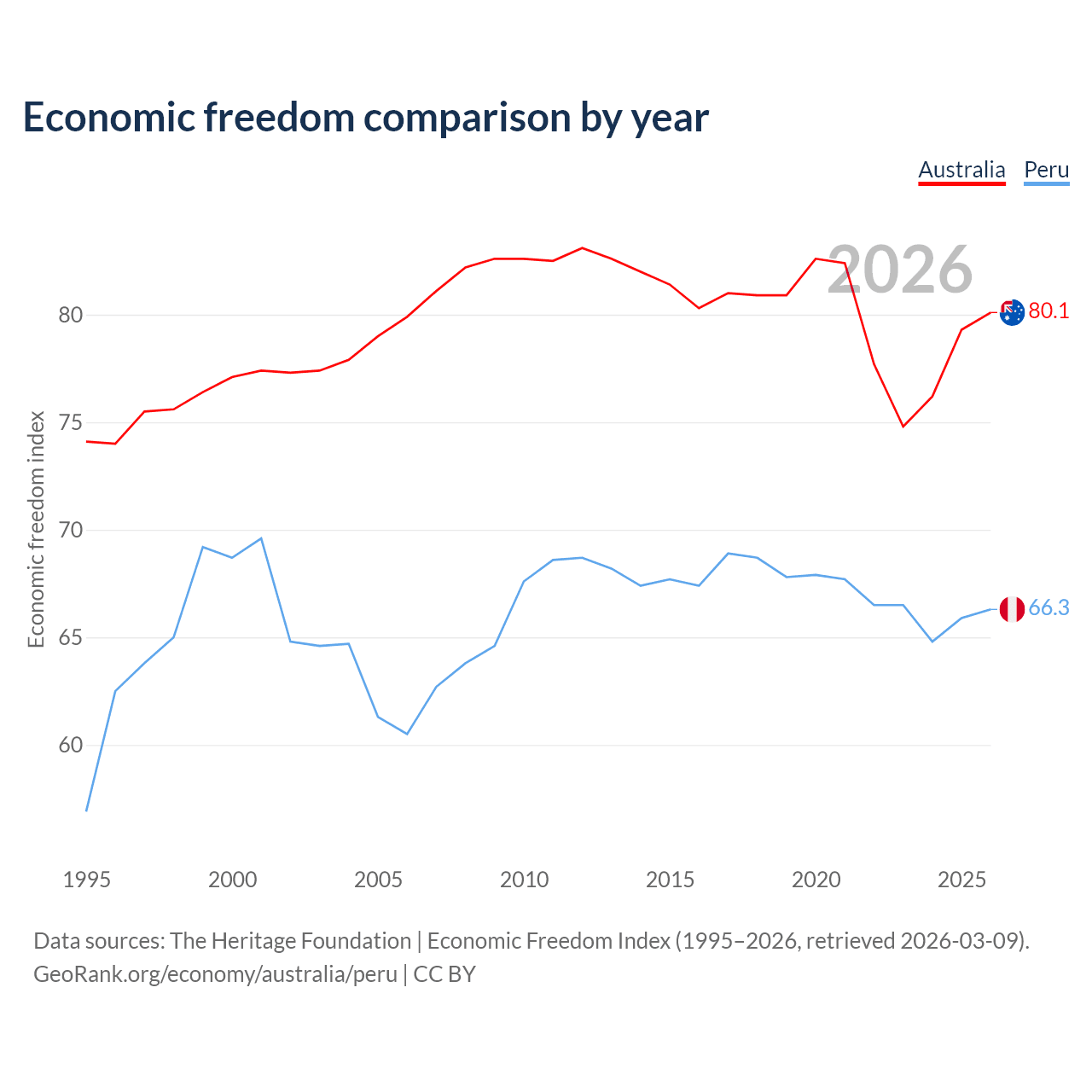 The Economic Freedom Index for Australia is 80.1, ranking 5/197, compared to 66.3 for Peru, ranking 62/197. The chart above displays a comparison of annual changes in economic freedom indexes.