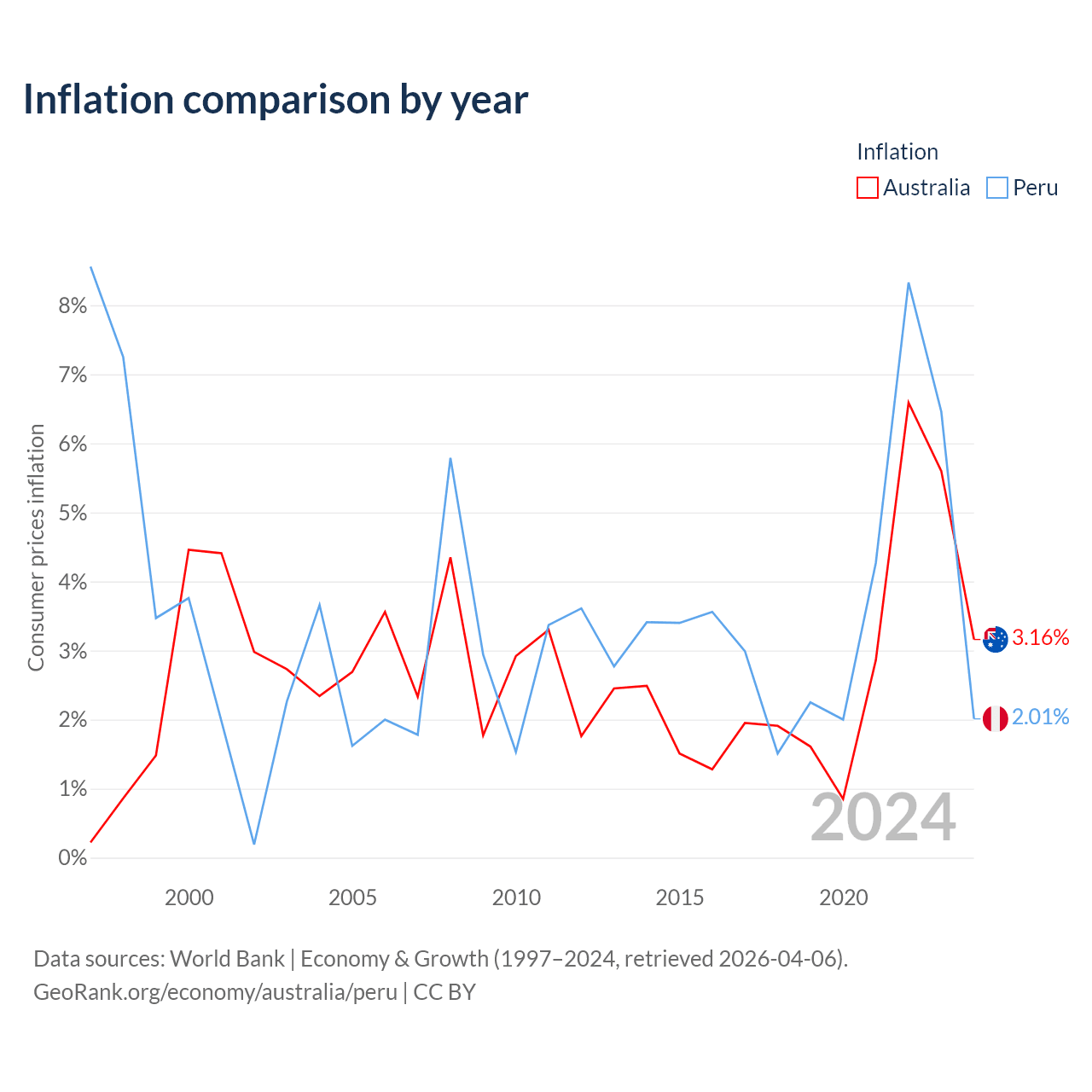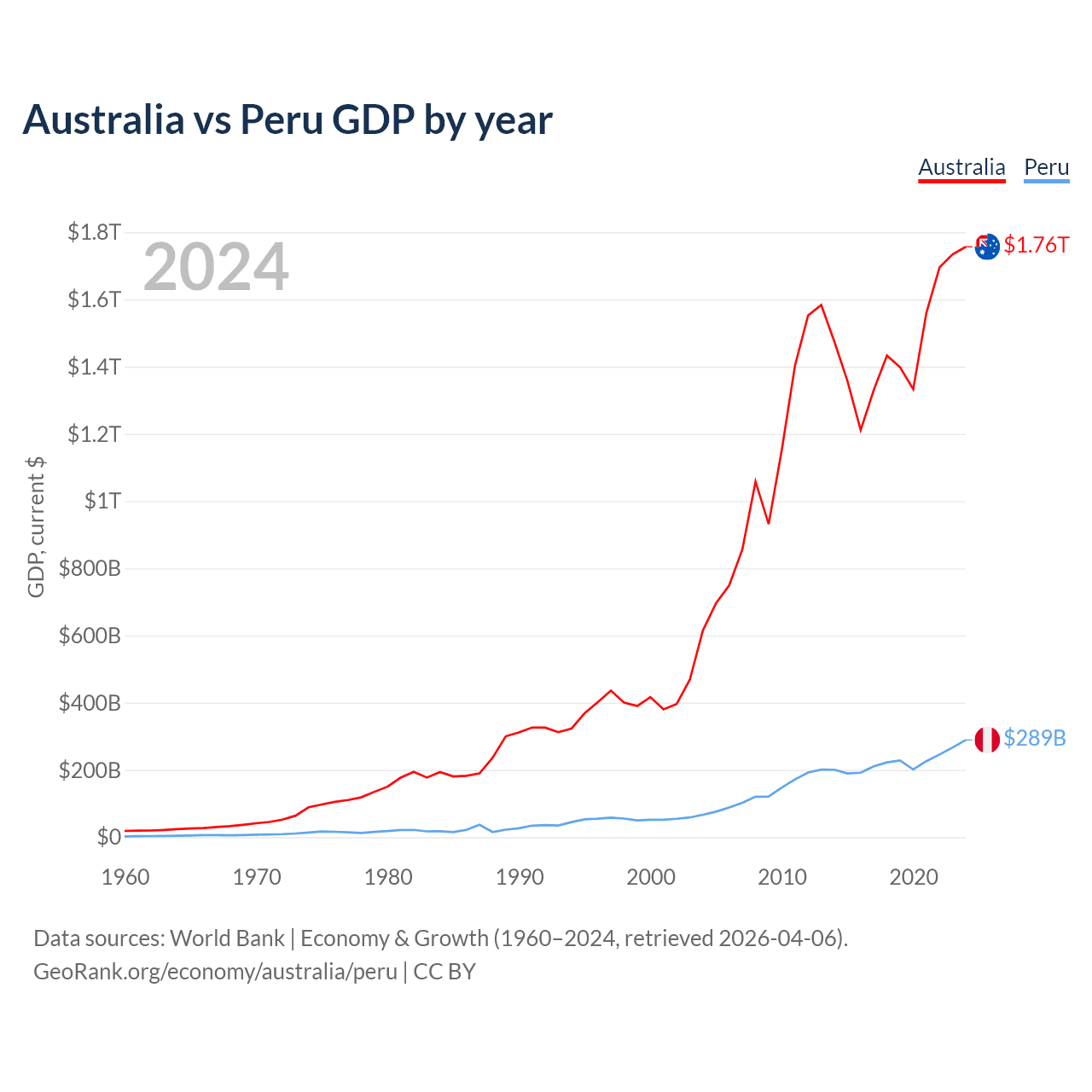 Australia has a GDP of $1.76T compared to $289B for Peru, ranking 14/197 and 49/197 by economy size, respectively.