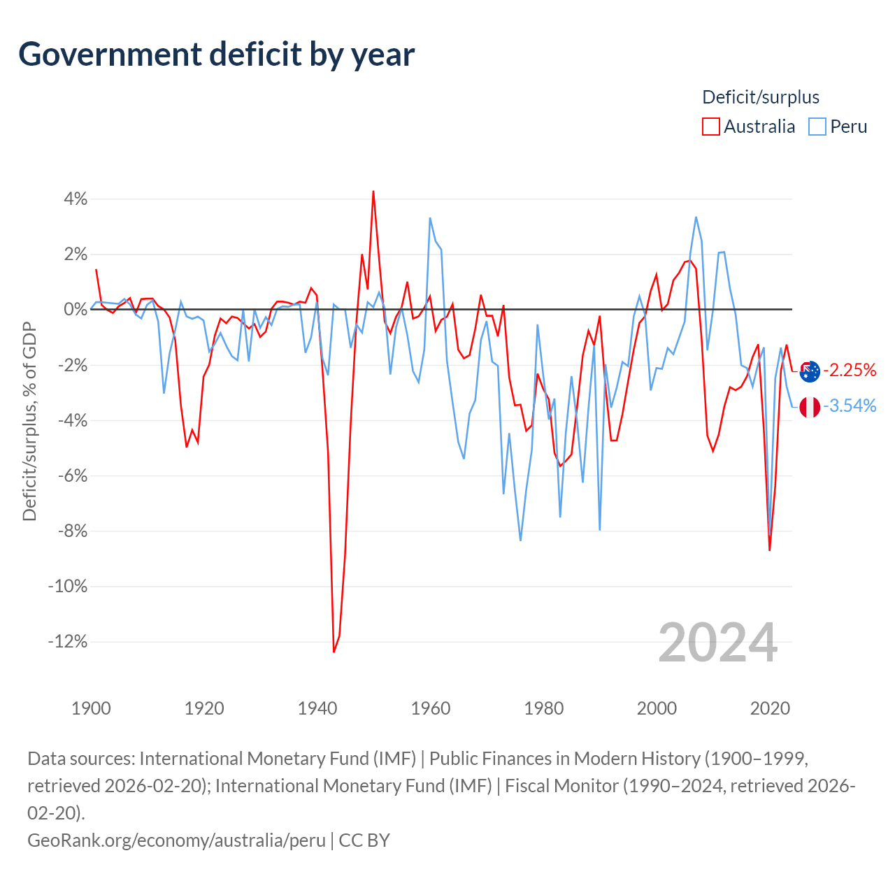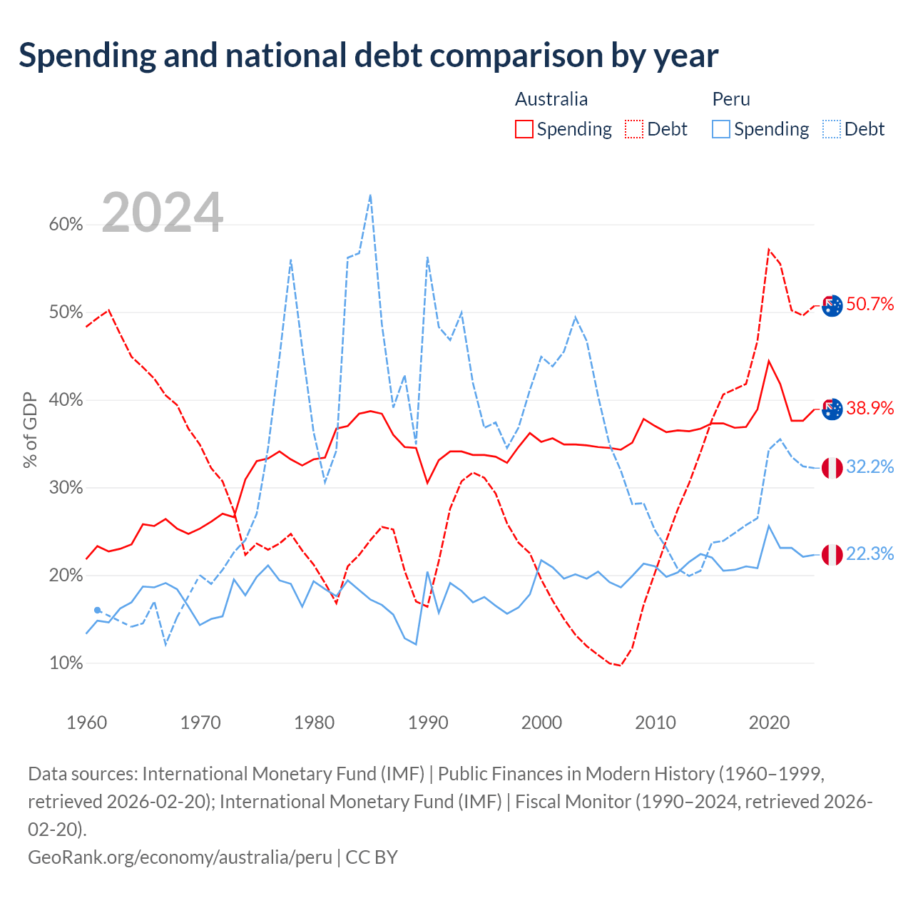 Australia has $891B in government debt (50.7% of GDP), compared to $93B (32.2% of GDP) in Peru.