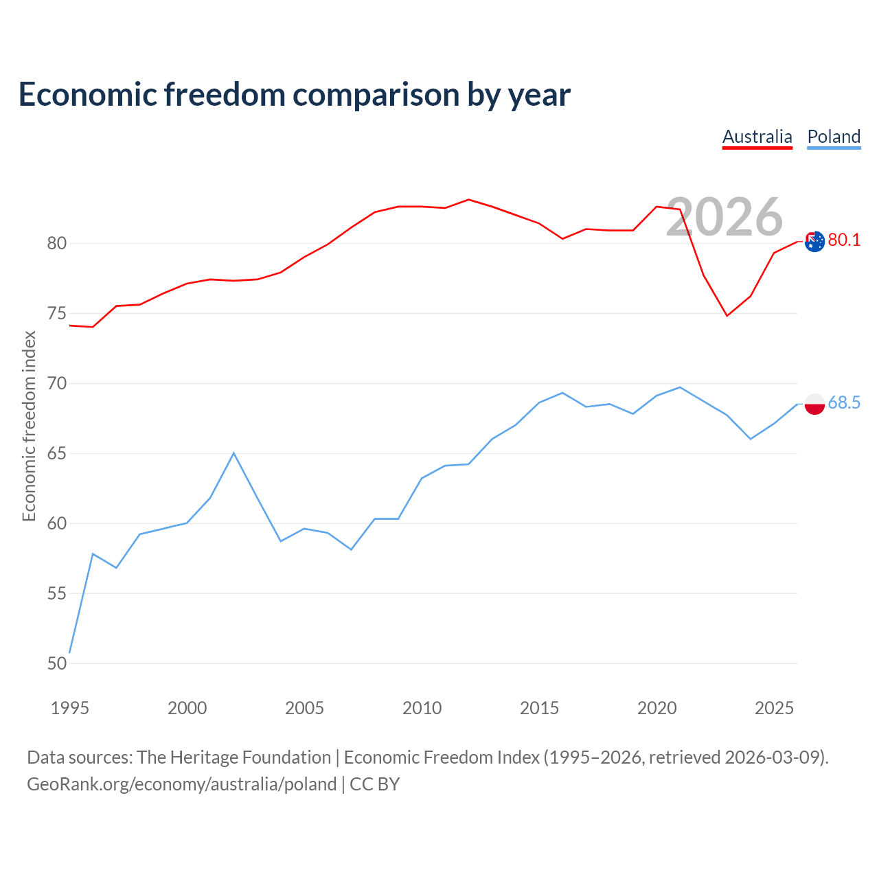 The Economic Freedom Index for Australia is 80.1, ranking 5/197, compared to 68.5 for Poland, ranking 46/197. The chart above displays a comparison of annual changes in economic freedom indexes.