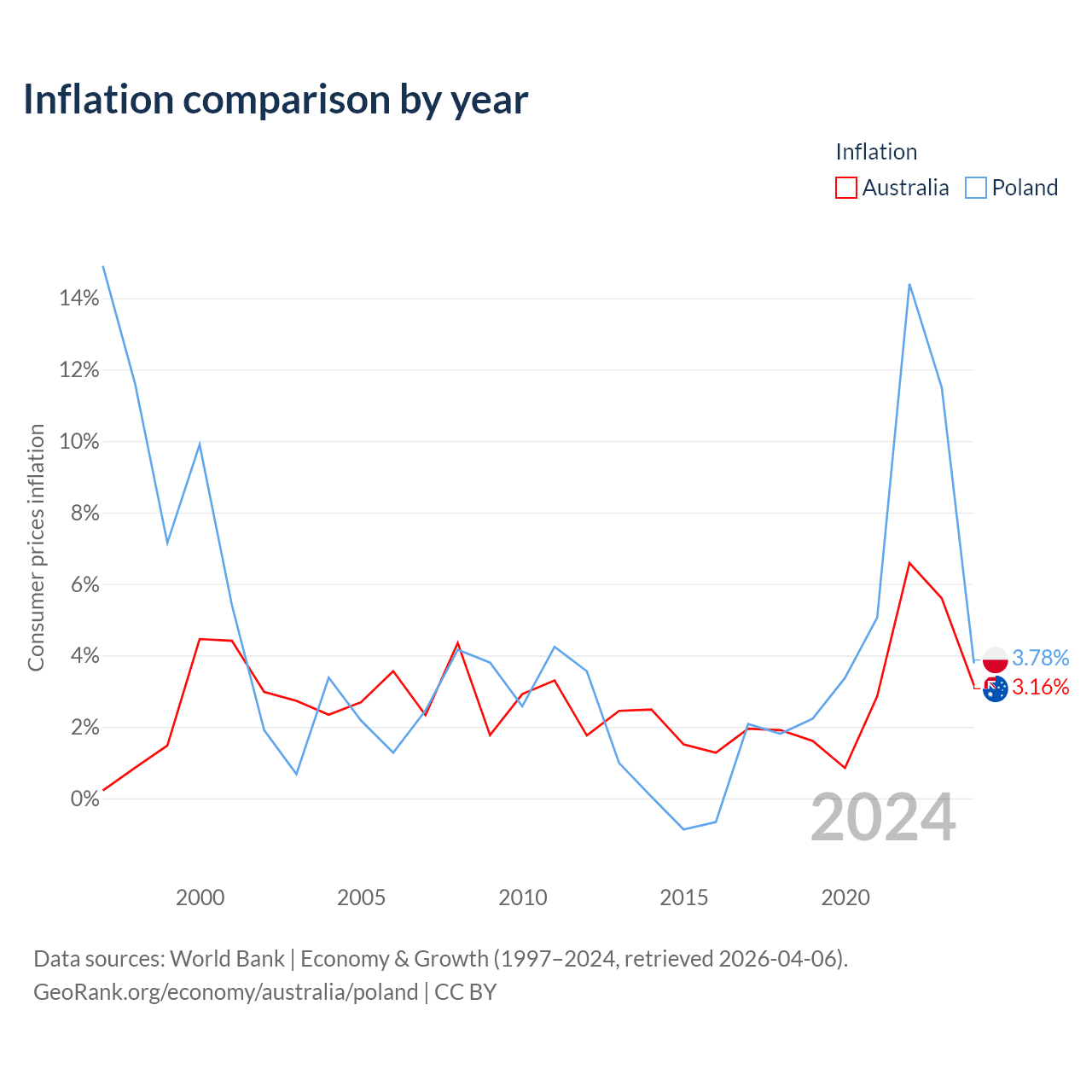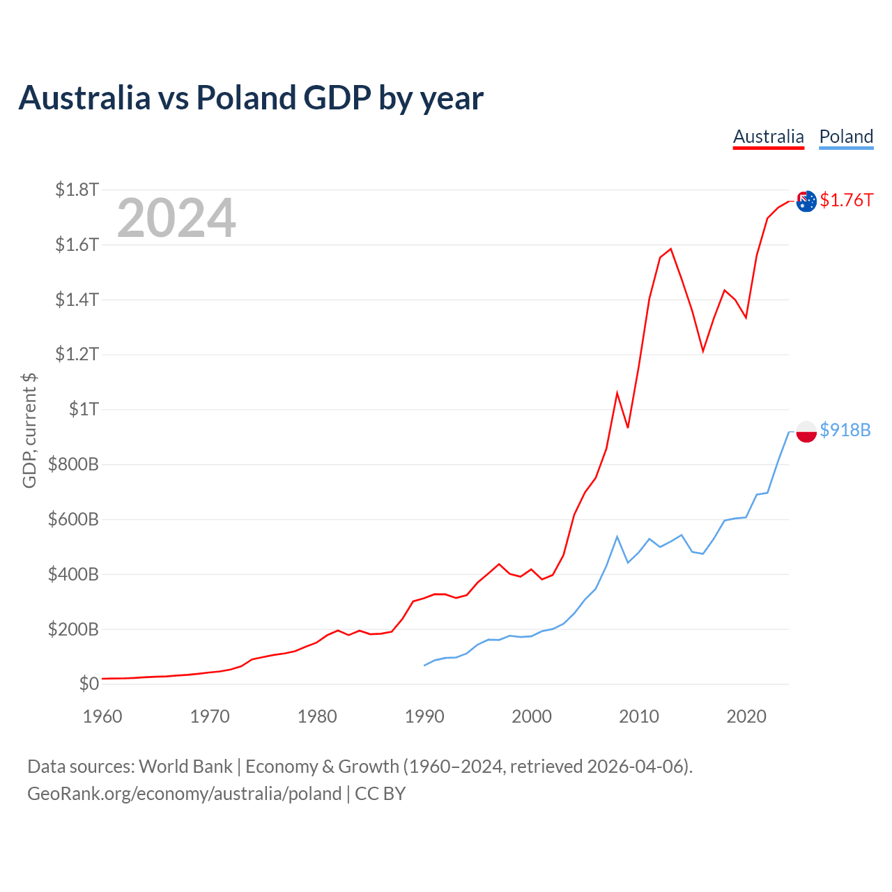 Australia has a GDP of $1.76T compared to $918B for Poland, ranking 14/197 and 21/197 by economy size, respectively.