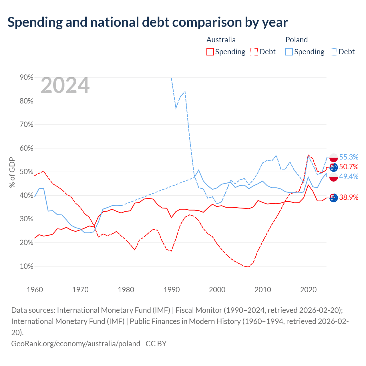 Australia has $891B in government debt (50.7% of GDP), compared to $507B (55.3% of GDP) in Poland.