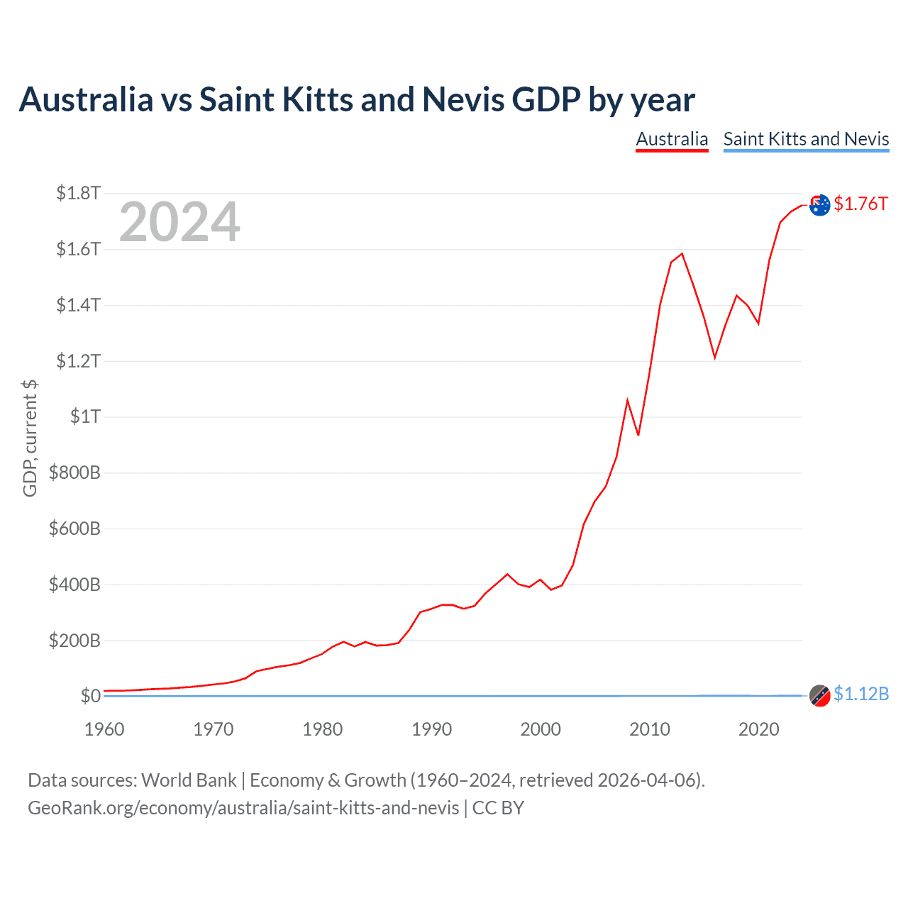 Australia has a GDP of $1.76T compared to $1.12B for Saint Kitts and Nevis, ranking 14/197 and 187/197 by economy size, respectively.