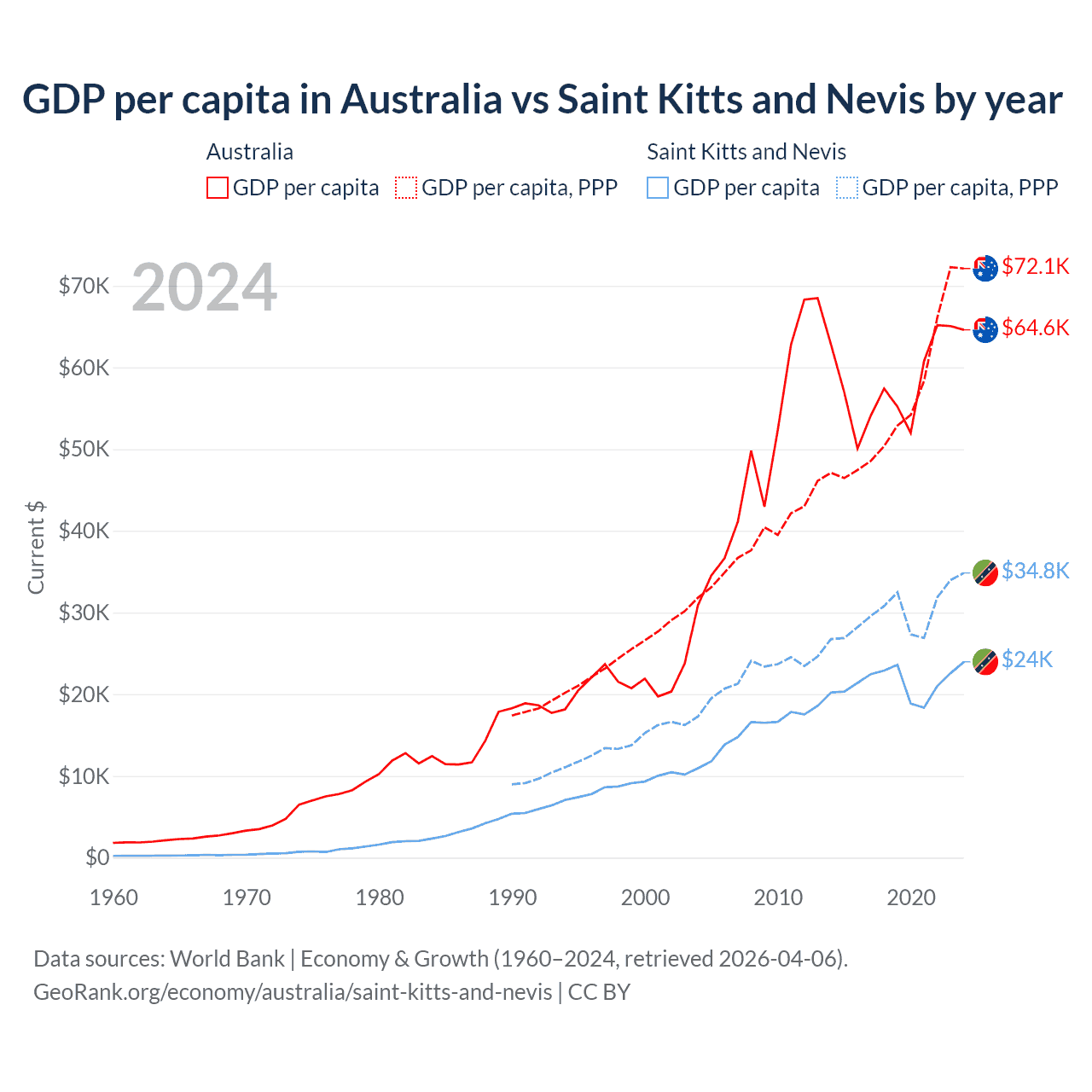 GDP per capita in Australia vs Saint Kitts and Nevis by year