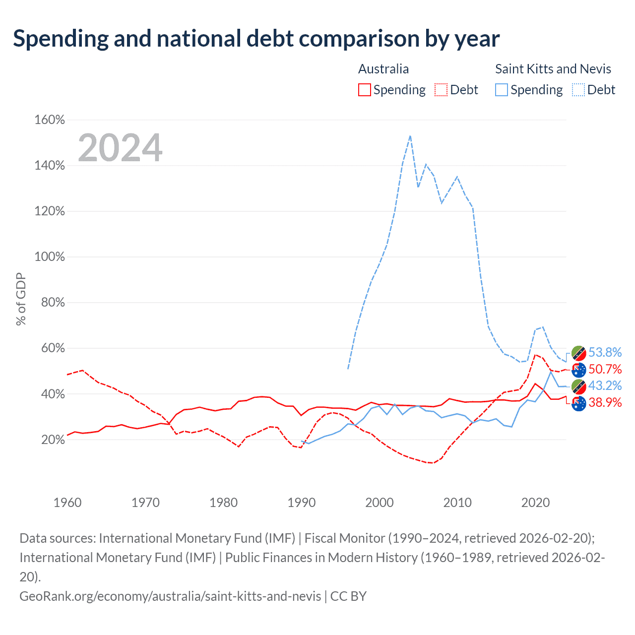 Australia has $891B in government debt (50.7% of GDP), compared to $604M (53.8% of GDP) in Saint Kitts and Nevis.