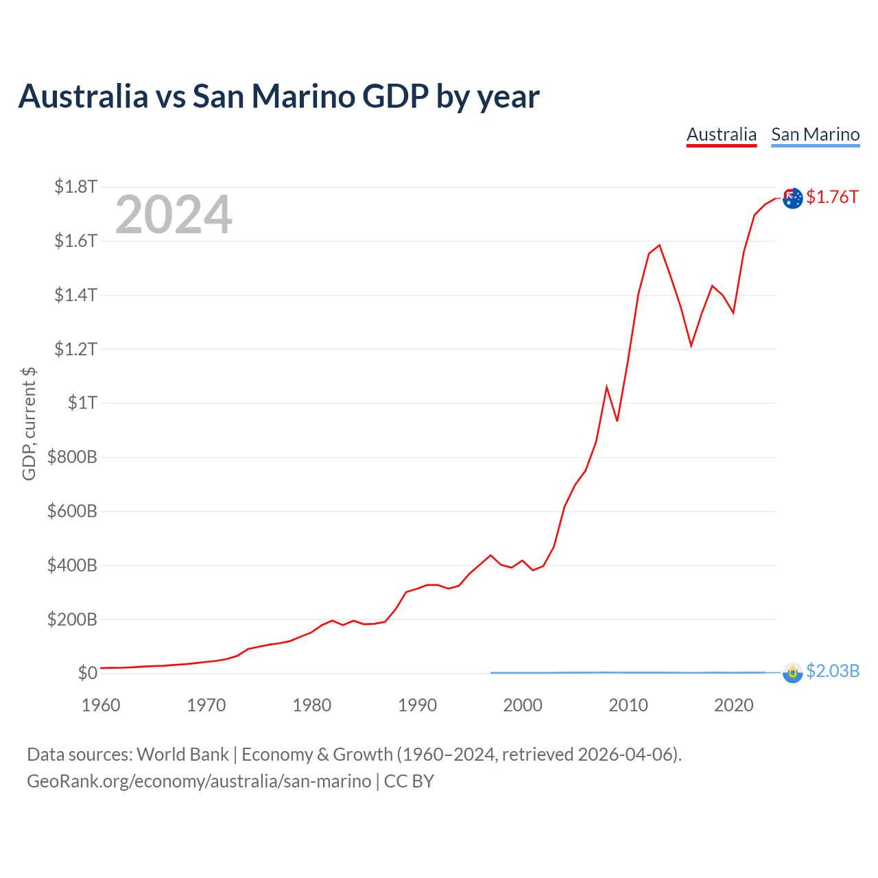 Australia has a GDP of $1.76T compared to $2.03B for San Marino, ranking 14/197 and 180/197 by economy size, respectively.