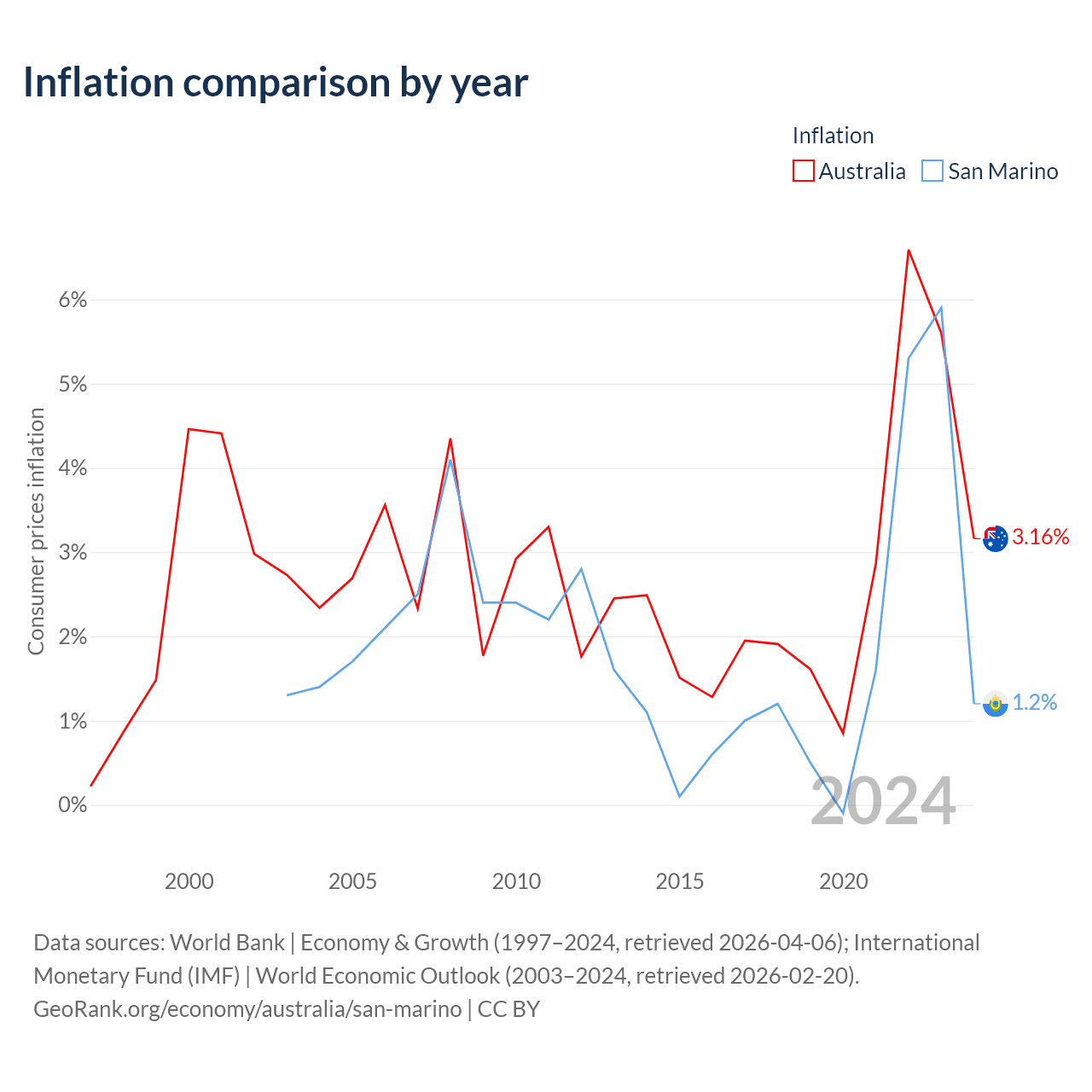 Over the past 22 years, Australia has recorded an average annual inflation rate of 2.73%, compared with 1.95% in San Marino. In 2024, inflation was 3.16% in Australia and 1.2% in San Marino.