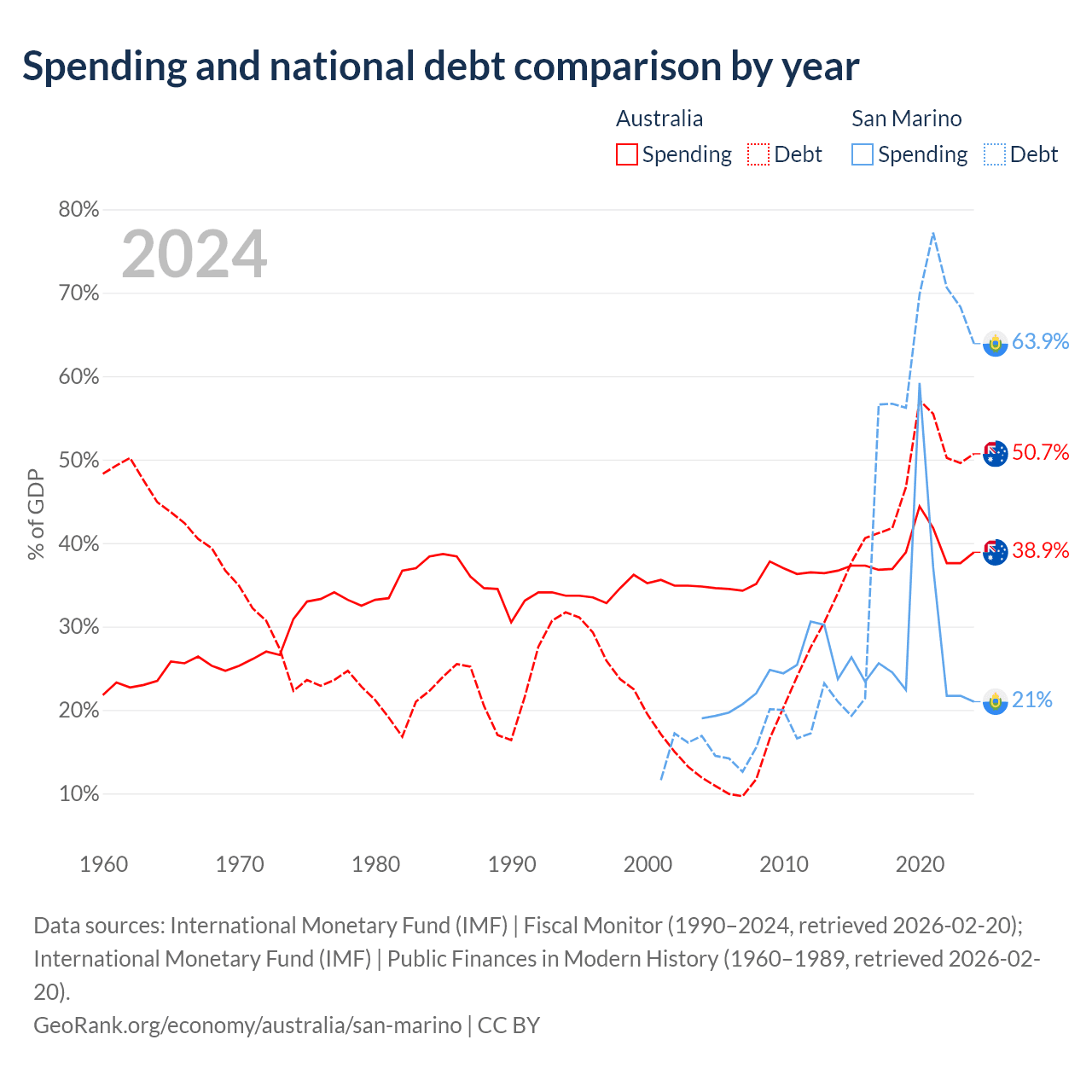 Australia has $891B in government debt (50.7% of GDP), compared to $1.39B (63.9% of GDP) in San Marino.