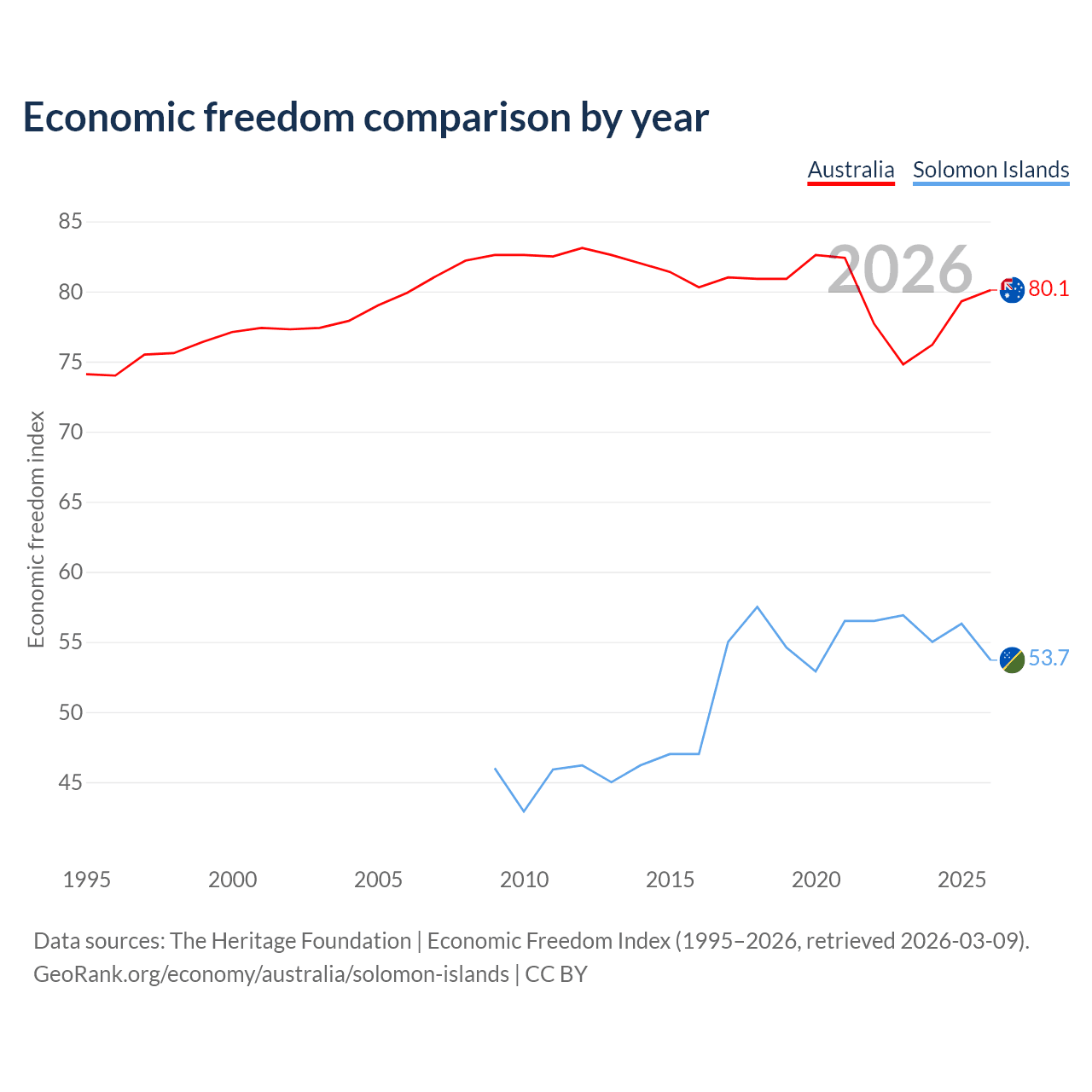 The Economic Freedom Index for Australia is 80.1, ranking 5/197, compared to 53.7 for the Solomon Islands, ranking 137/197. The chart above displays a comparison of annual changes in economic freedom indexes.