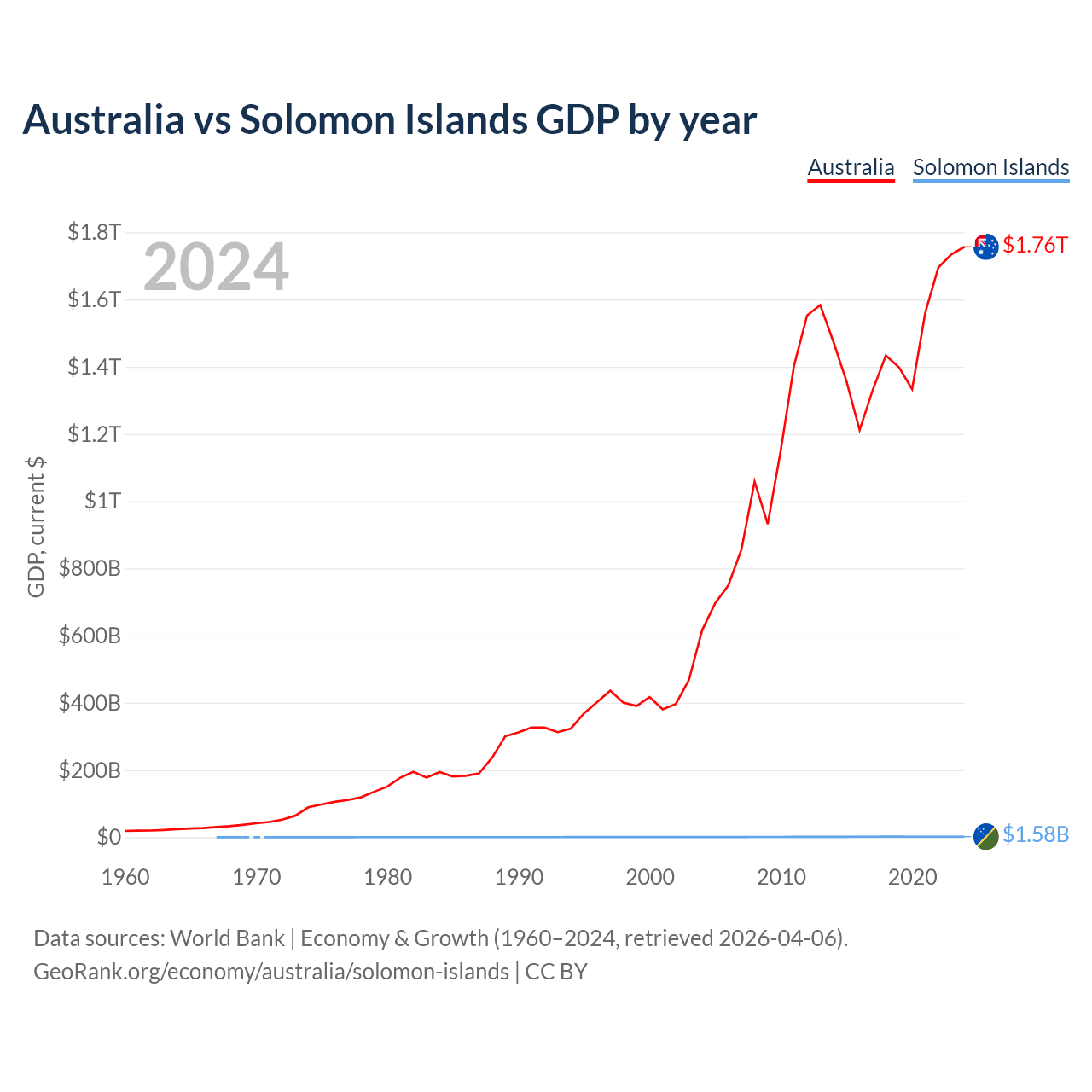 Australia has a GDP of $1.76T compared to $1.58B for the Solomon Islands, ranking 14/197 and 182/197 by economy size, respectively.