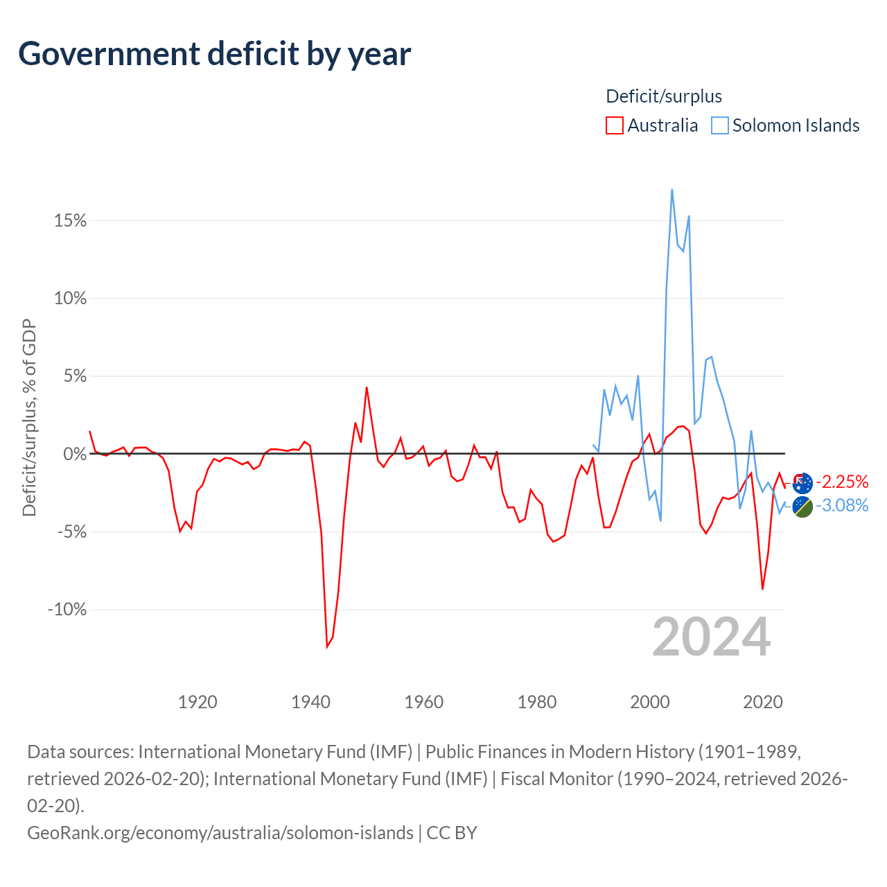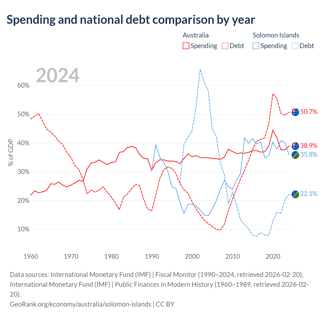Australia has $891B in government debt (50.7% of GDP), compared to $350M (22.1% of GDP) in the Solomon Islands.