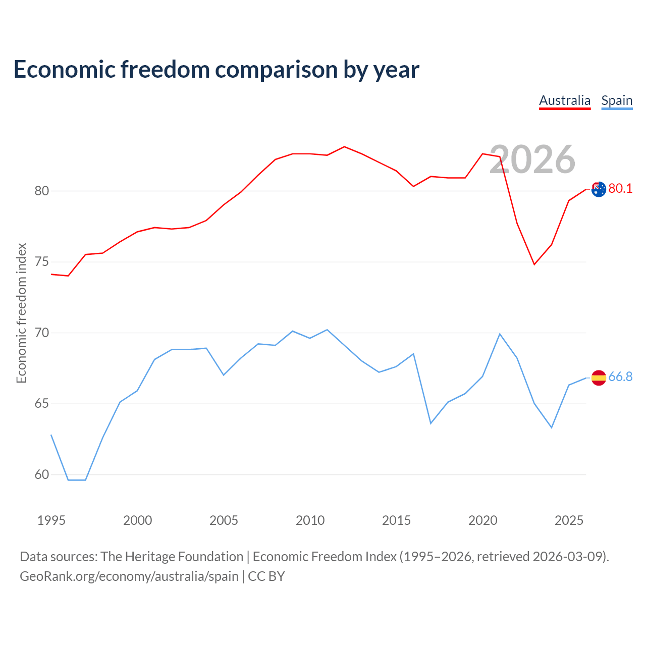 The Economic Freedom Index for Australia is 80.1, ranking 5/197, compared to 66.8 for Spain, ranking 59/197. The chart above displays a comparison of annual changes in economic freedom indexes.