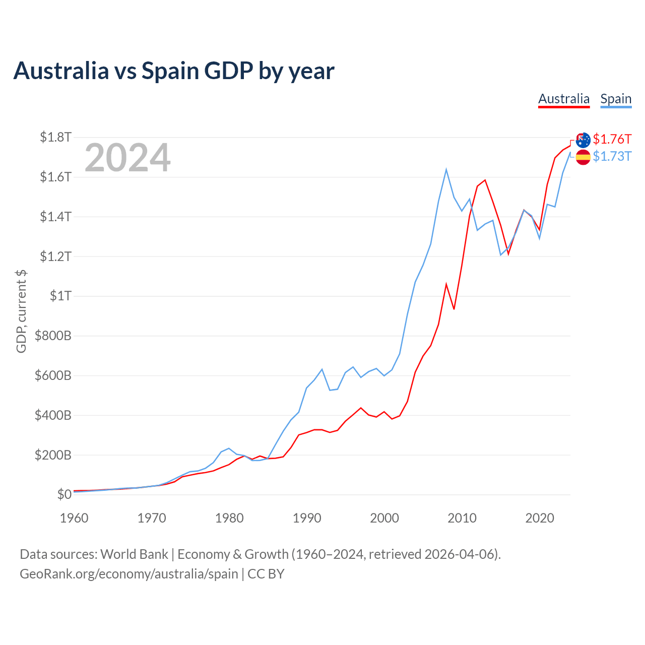 Australia vs Spain GDP by year