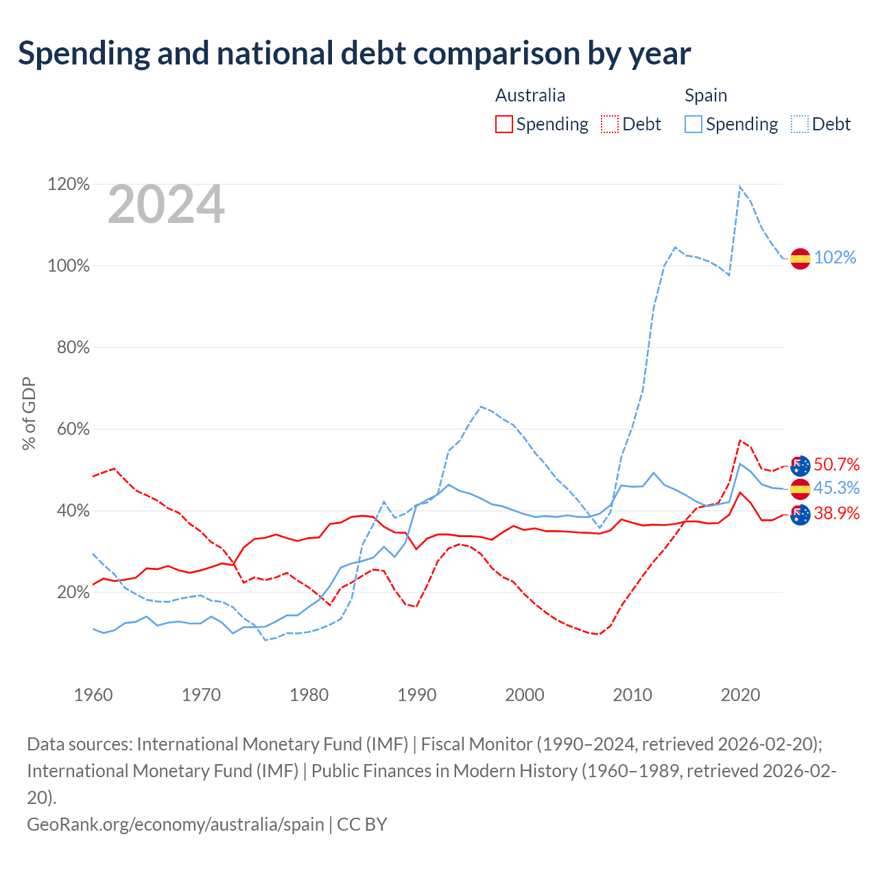 Australia has $891B in government debt (50.7% of GDP), compared to $1.75T (101.6% of GDP) in Spain.