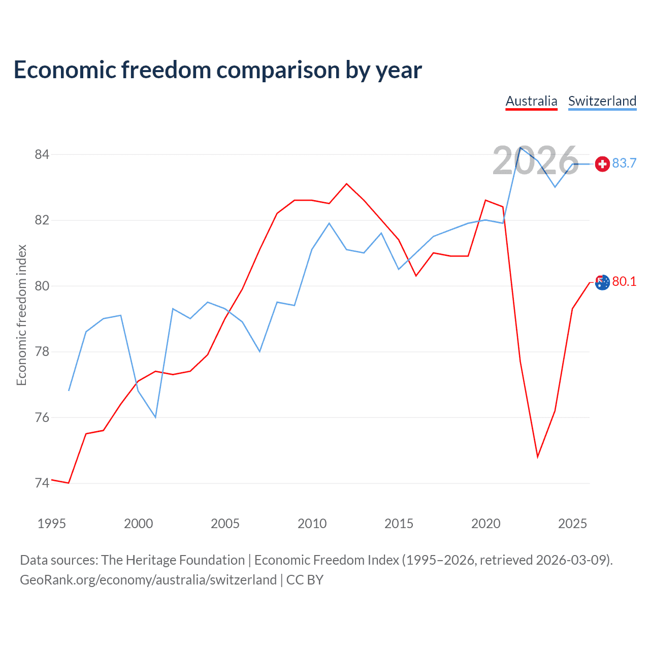 The Economic Freedom Index for Australia is 80.1, ranking 5/197, compared to 83.7 for Switzerland, ranking 2/197. The chart above displays a comparison of annual changes in economic freedom indexes.