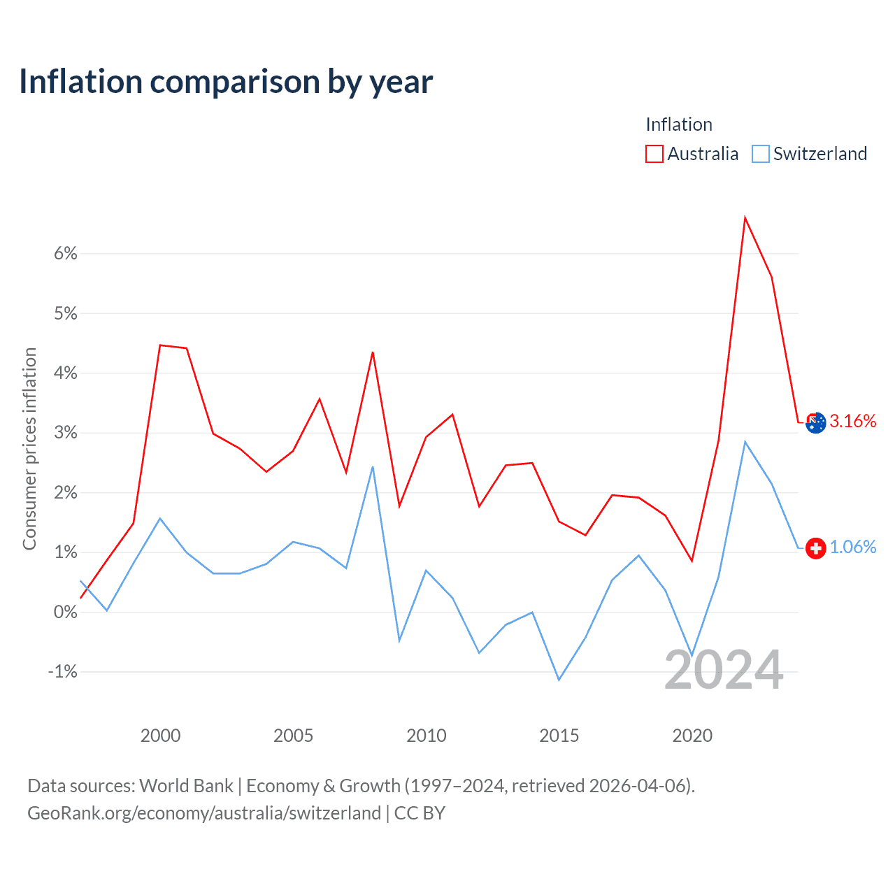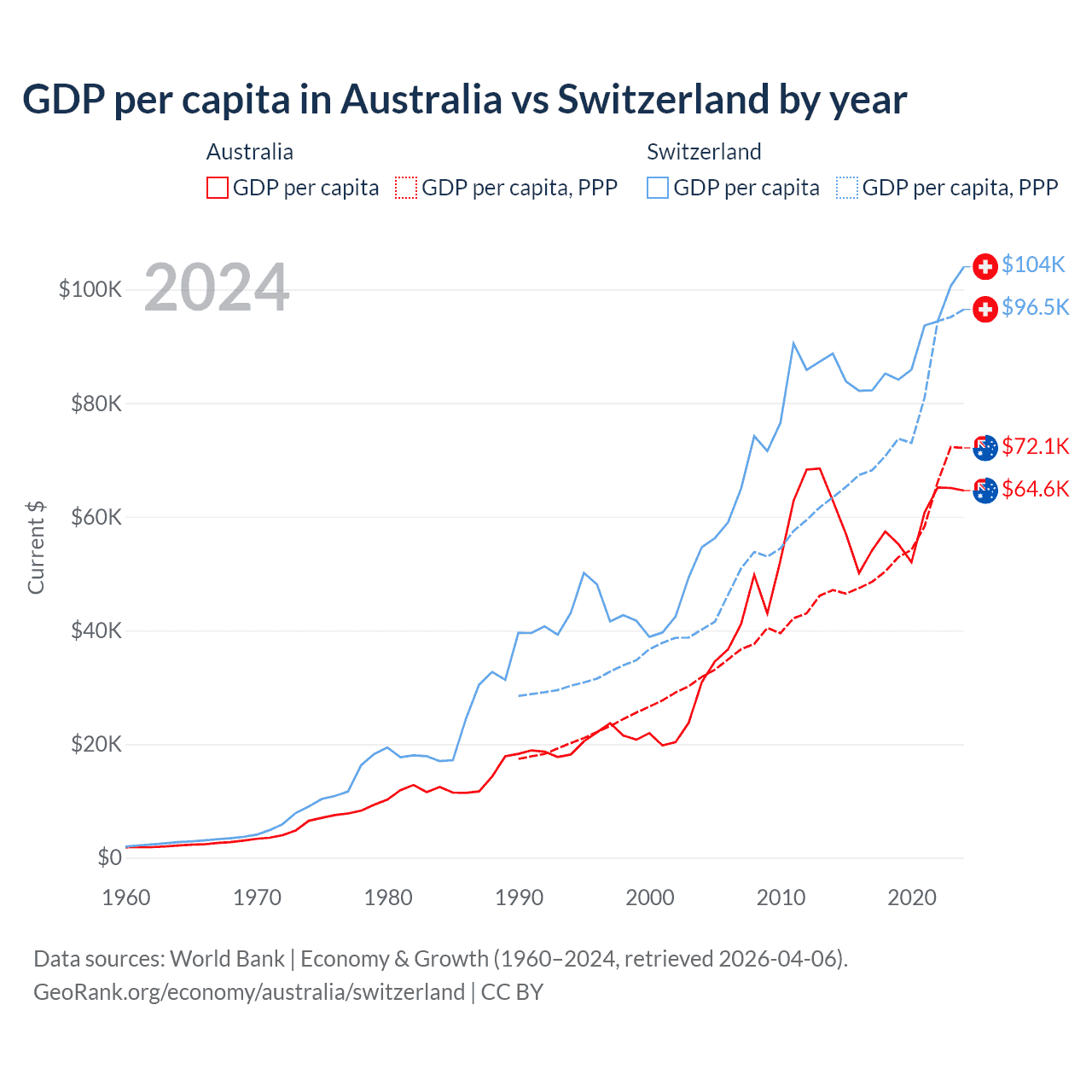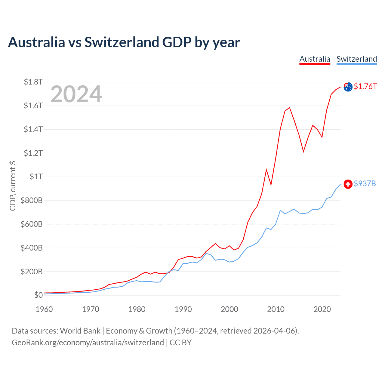 Australia has a GDP of $1.76T compared to $937B for Switzerland, ranking 14/197 and 20/197 by economy size, respectively.