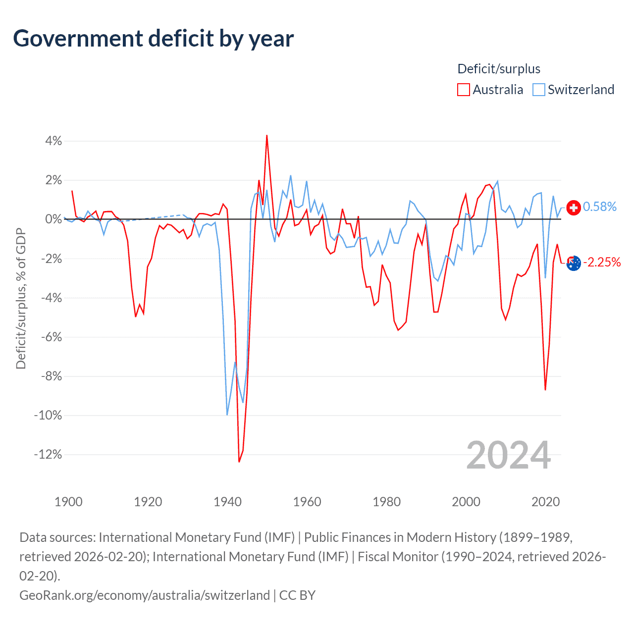 Australia has $891B in government debt (50.7% of GDP), compared to $351B (37.5% of GDP) in Switzerland.