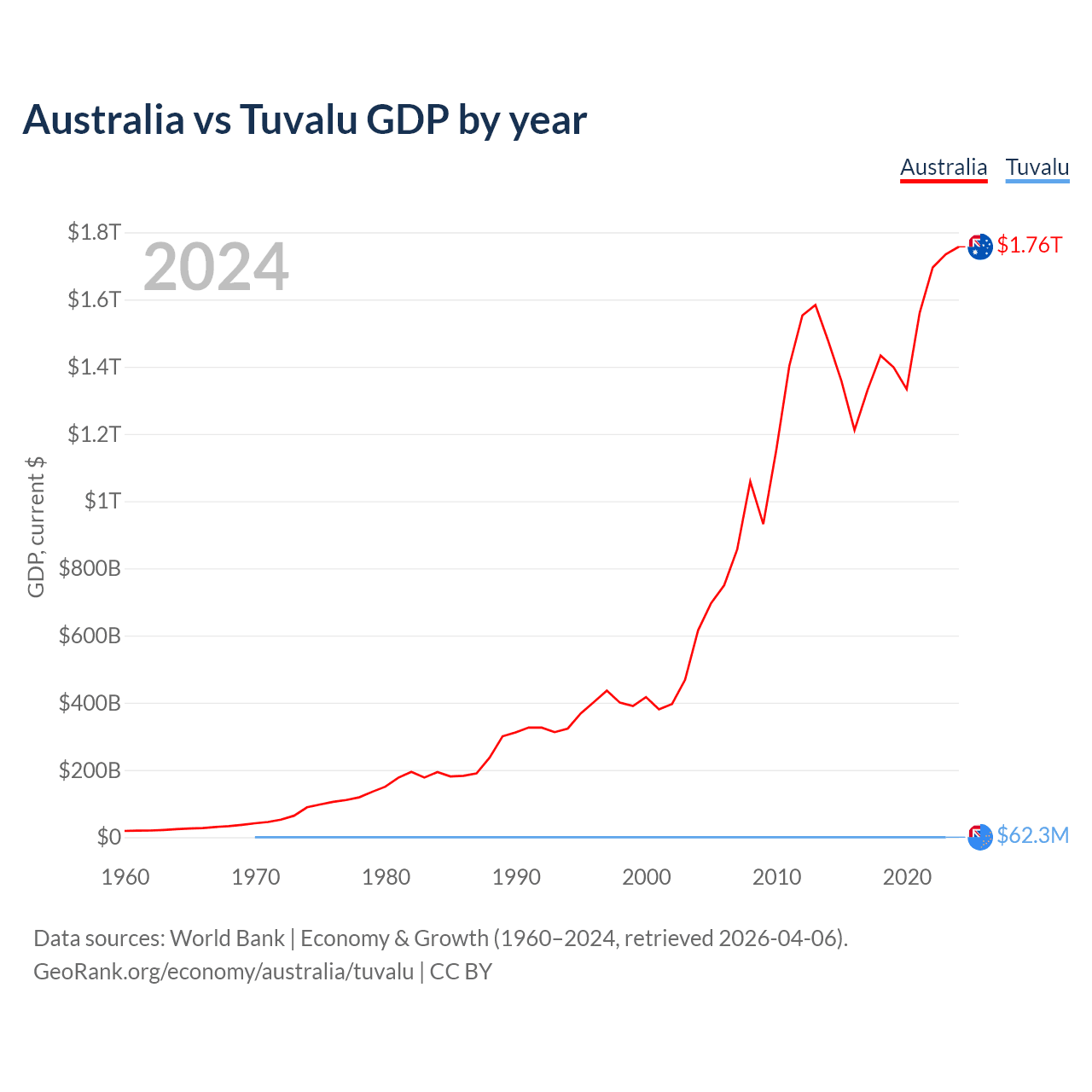Australia has a GDP of $1.76T compared to $62.3M for Tuvalu, ranking 14/197 and 196/197 by economy size, respectively.