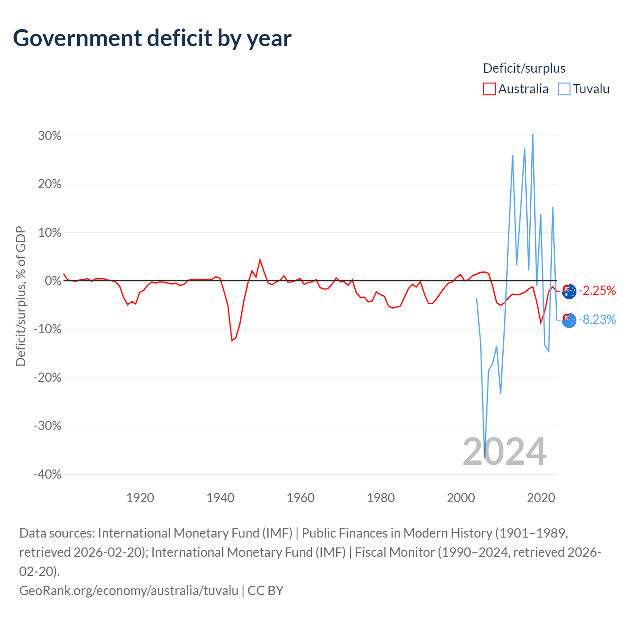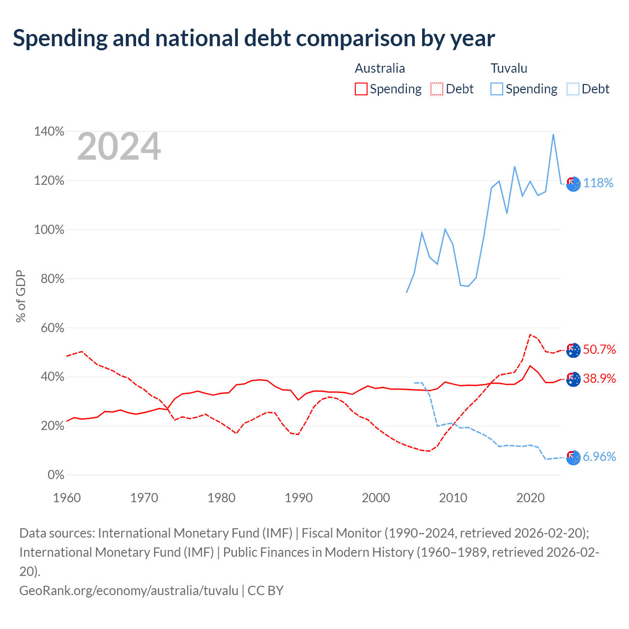 Australia has $891B in government debt (50.7% of GDP), compared to $4.15M (6.96% of GDP) in Tuvalu.