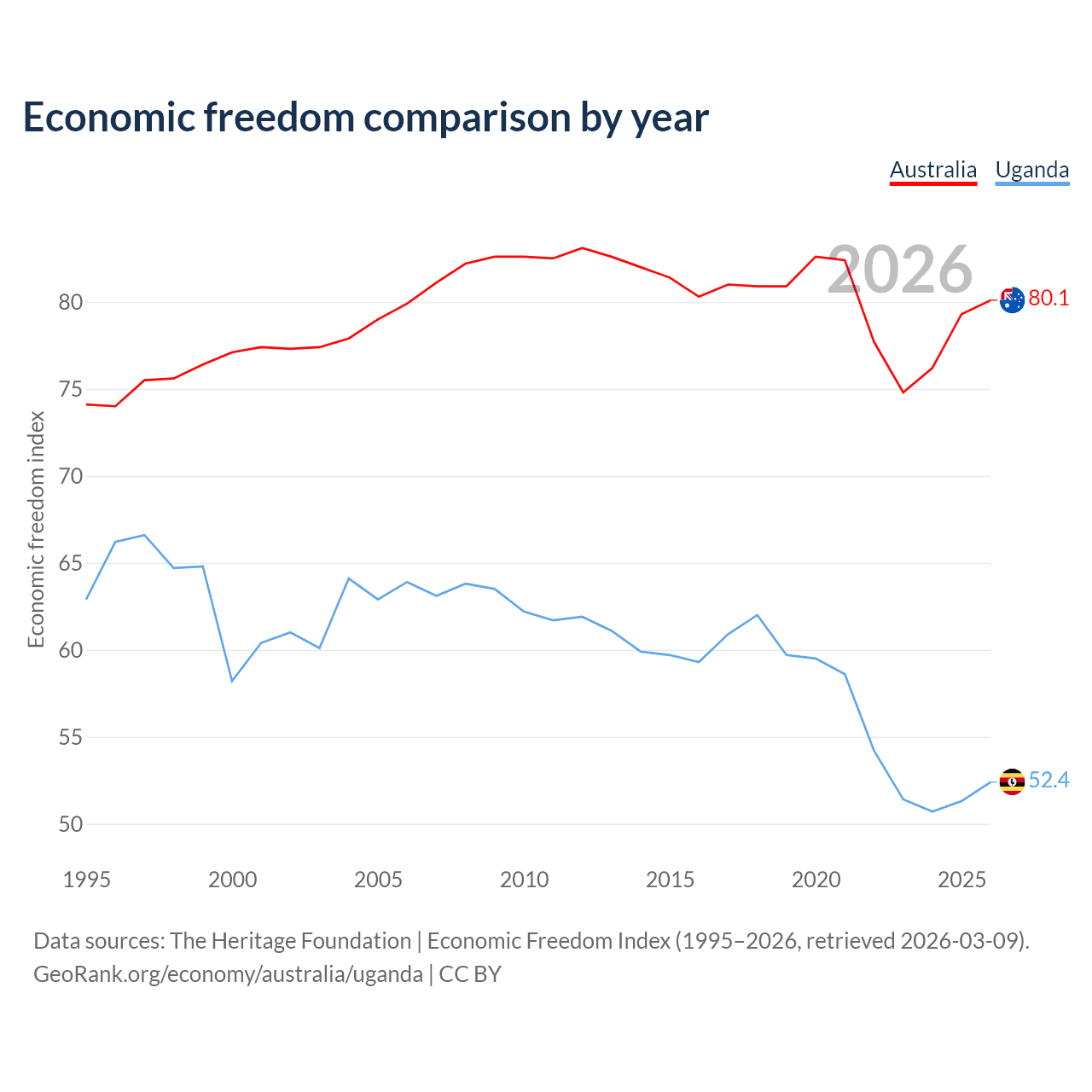 The Economic Freedom Index for Australia is 80.1, ranking 5/197, compared to 52.4 for Uganda, ranking 149/197. The chart above displays a comparison of annual changes in economic freedom indexes.