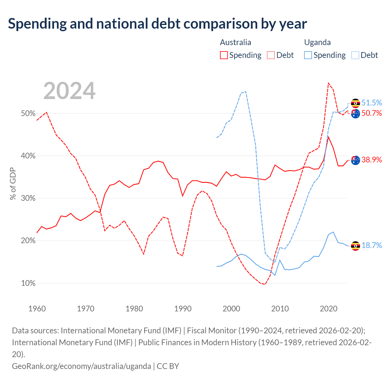 Australia has $891B in government debt (50.7% of GDP), compared to $27.8B (51.5% of GDP) in Uganda.