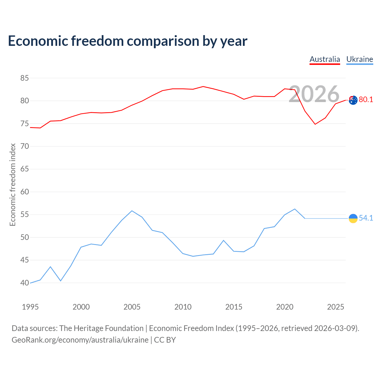 The Economic Freedom Index for Australia is 80.1, ranking 5/197, compared to 54.1 for Ukraine, ranking 135/197. The chart above displays a comparison of annual changes in economic freedom indexes.