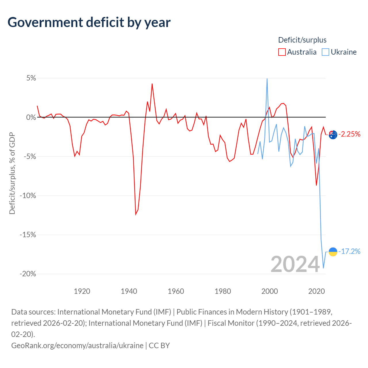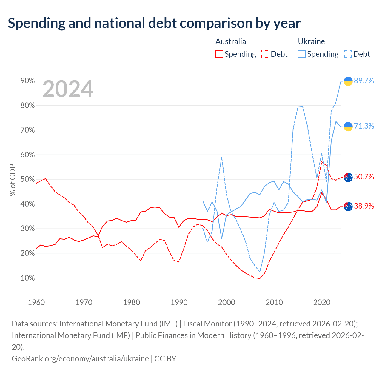 Australia has $891B in government debt (50.7% of GDP), compared to $171B (89.7% of GDP) in Ukraine.