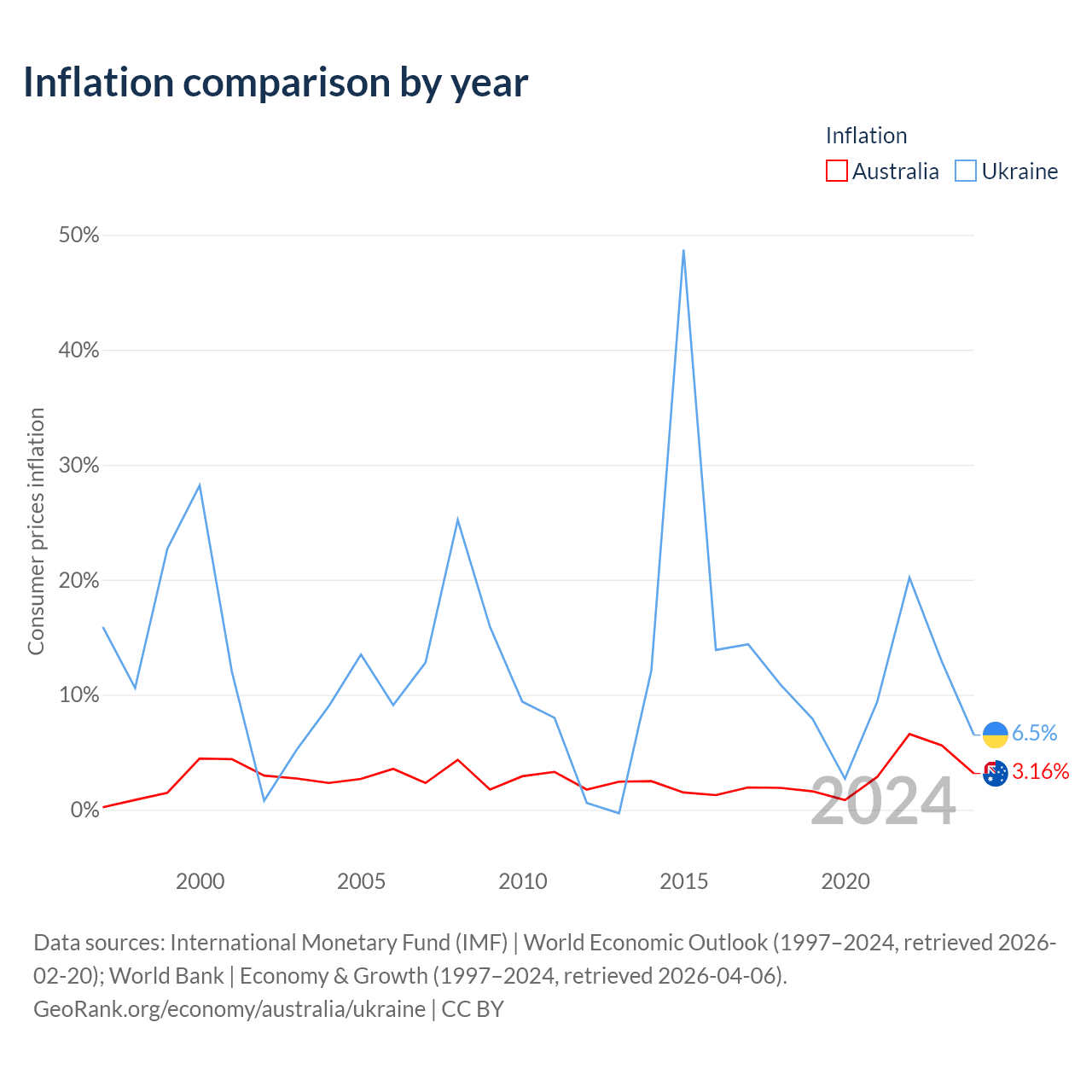 Australia has a GDP of $1.76T compared to $191B for Ukraine, ranking 14/197 and 57/197 by economy size, respectively.
