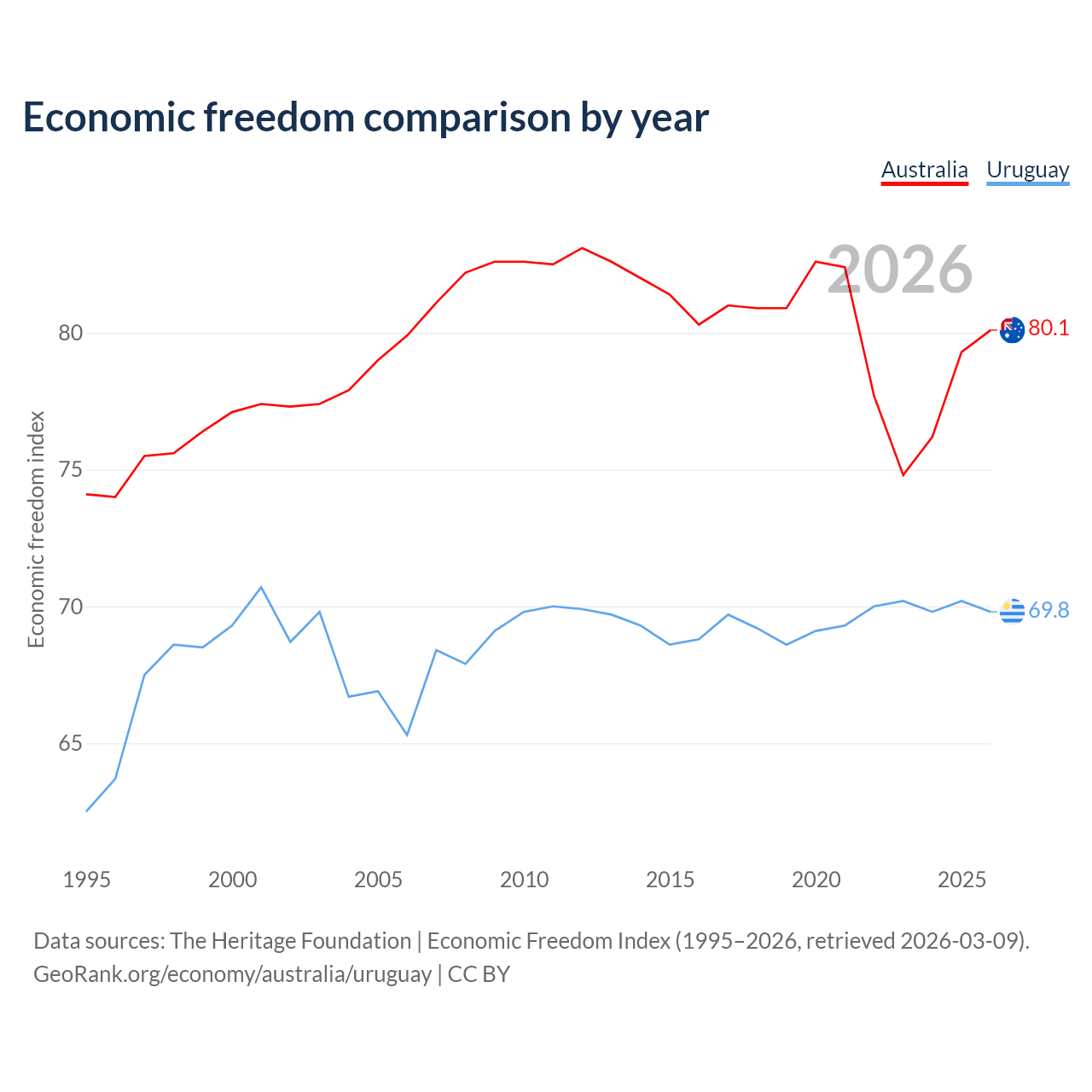 The Economic Freedom Index for Australia is 80.1, ranking 5/197, compared to 69.8 for Uruguay, ranking 39/197. The chart above displays a comparison of annual changes in economic freedom indexes.
