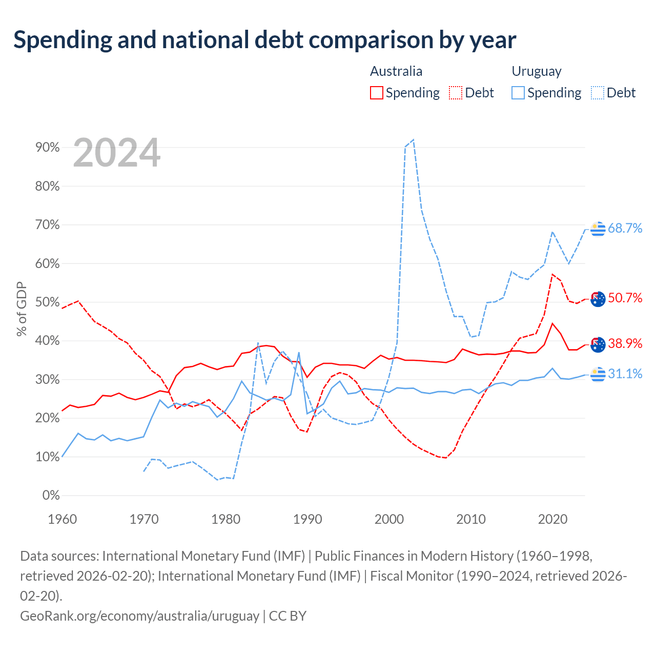 Australia has $891B in government debt (50.7% of GDP), compared to $55.6B (68.7% of GDP) in Uruguay.