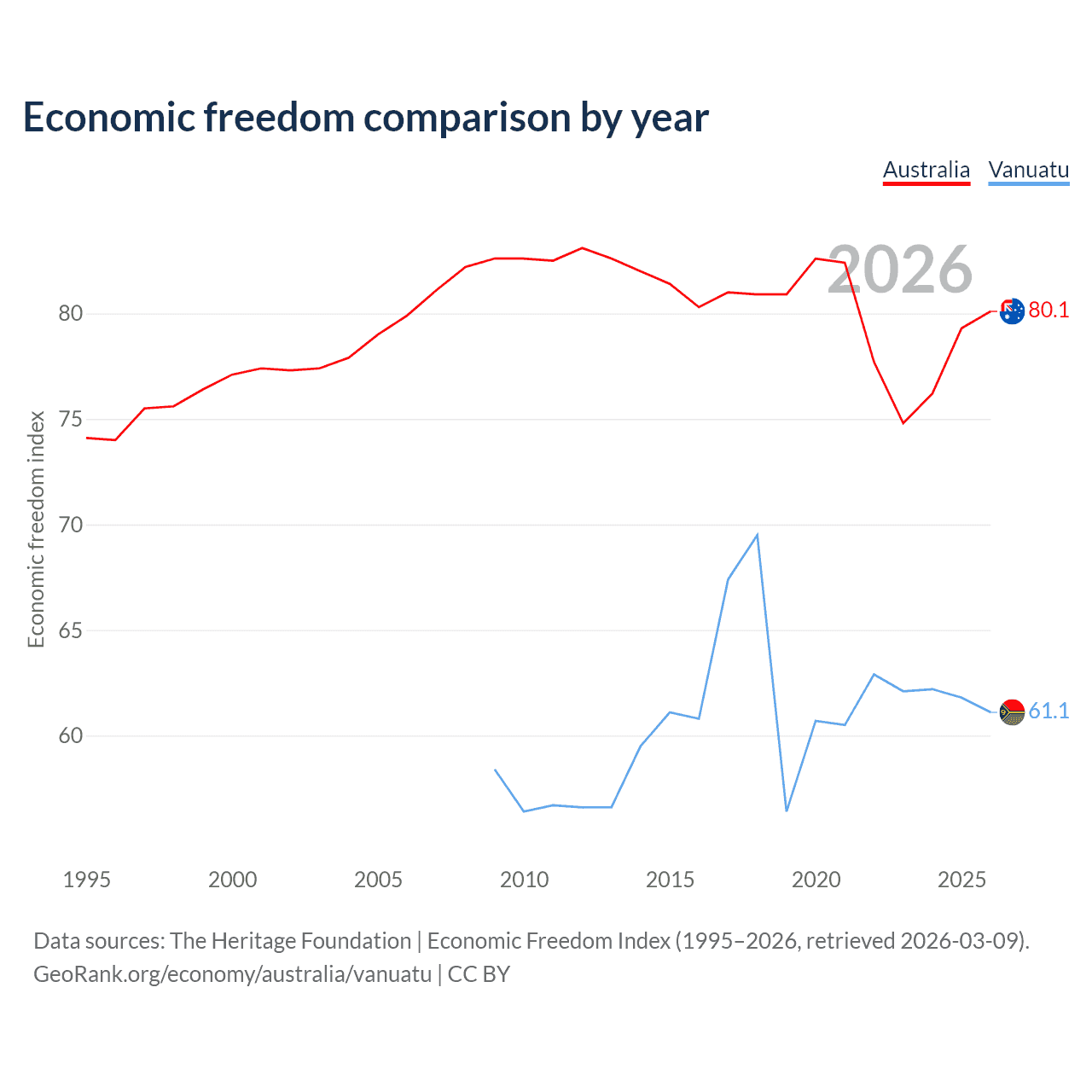 The Economic Freedom Index for Australia is 80.1, ranking 5/197, compared to 61.1 for Vanuatu, ranking 92/197. The chart above displays a comparison of annual changes in economic freedom indexes.