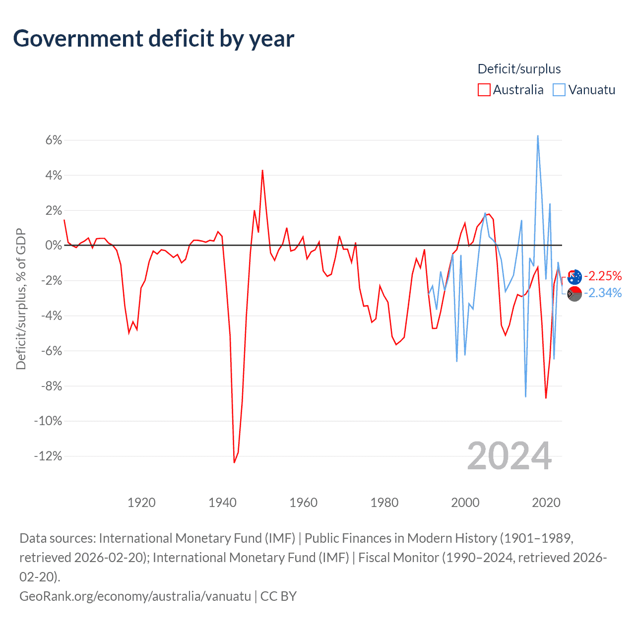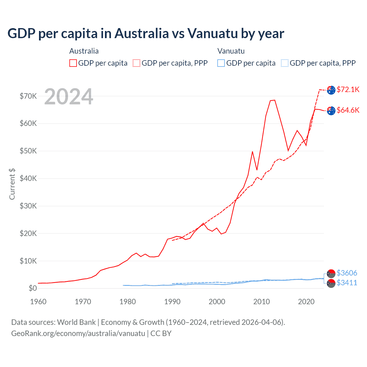 Australia has a GDP of $1.76T compared to $1.12B for Vanuatu, ranking 14/197 and 188/197 by economy size, respectively.