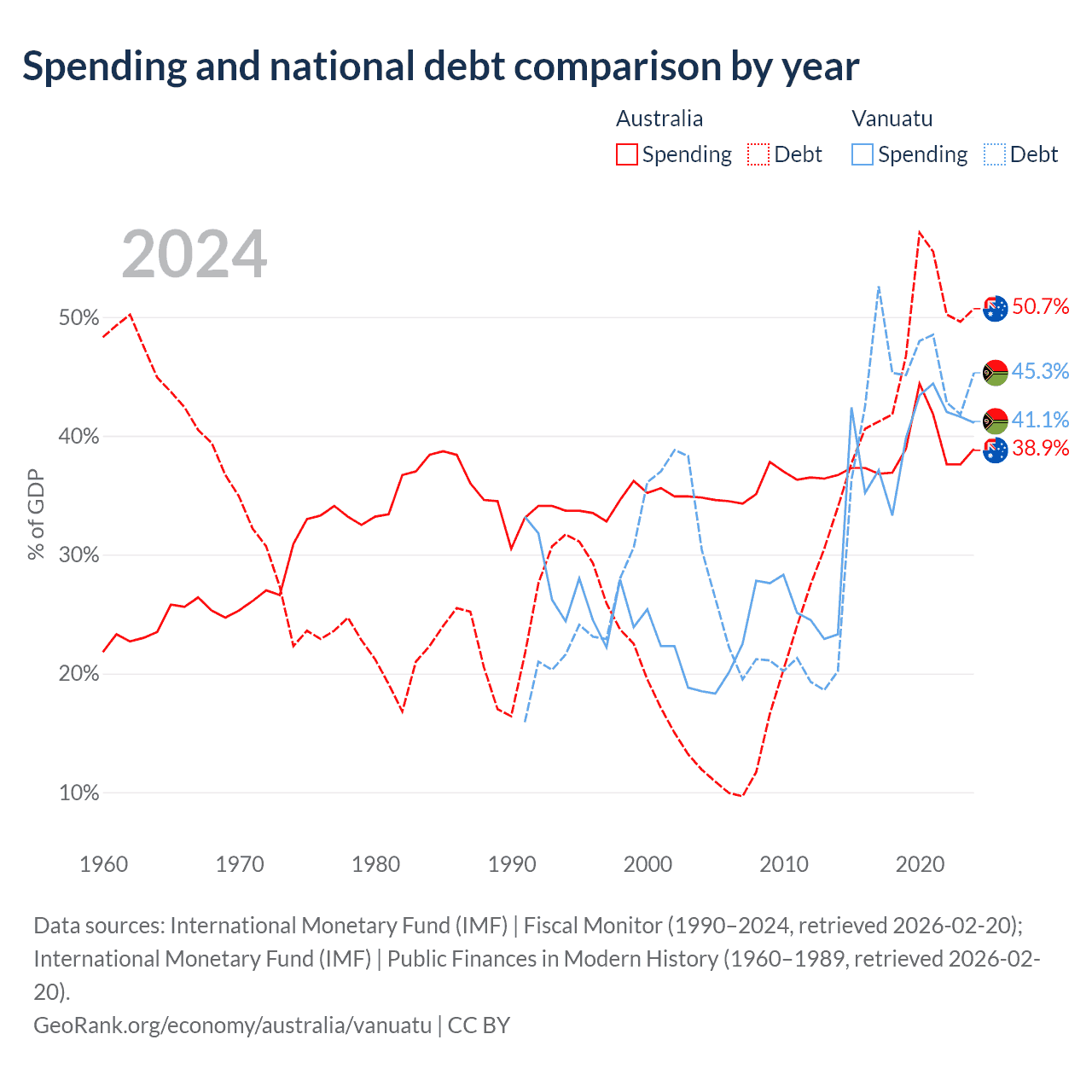 Australia has $891B in government debt (50.7% of GDP), compared to $507M (45.3% of GDP) in Vanuatu.