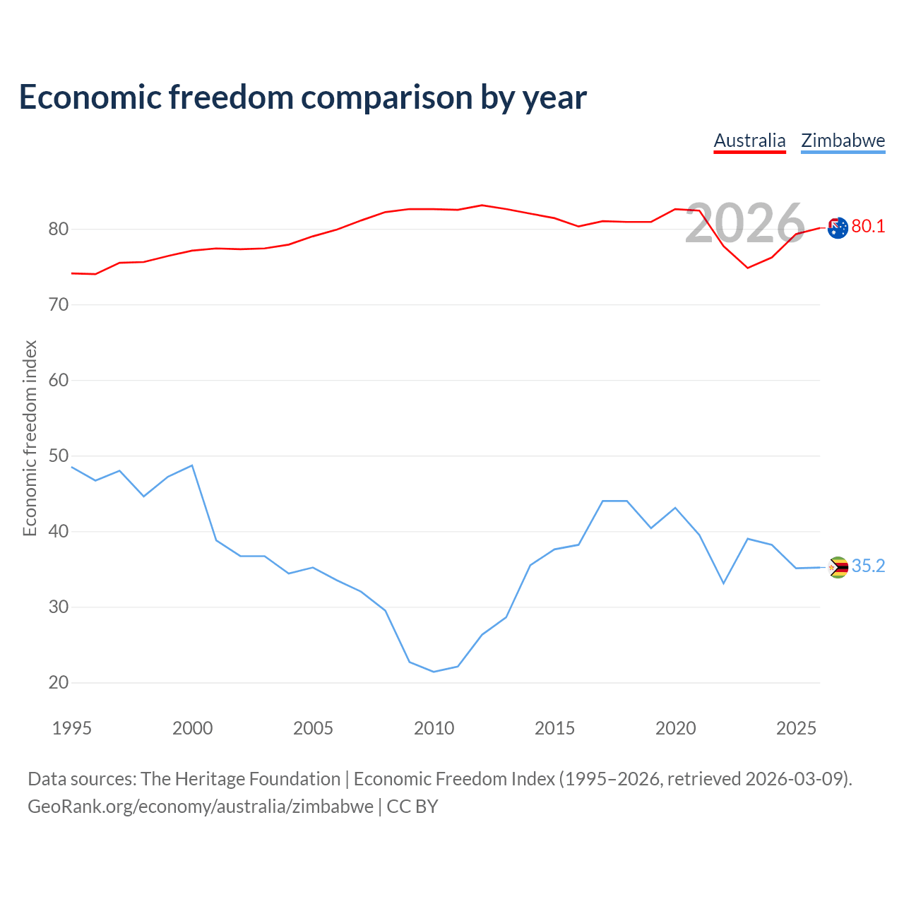 The Economic Freedom Index for Australia is 80.1, ranking 5/197, compared to 35.2 for Zimbabwe, ranking 190/197. The chart above displays a comparison of annual changes in economic freedom indexes.