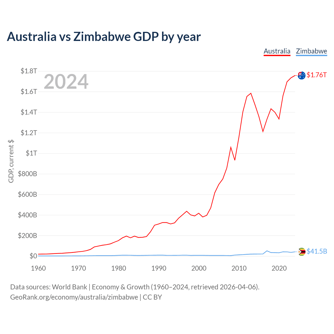 Australia has a GDP of $1.76T compared to $41.5B for Zimbabwe, ranking 14/197 and 102/197 by economy size, respectively.