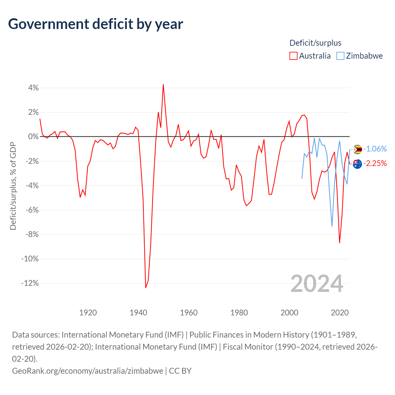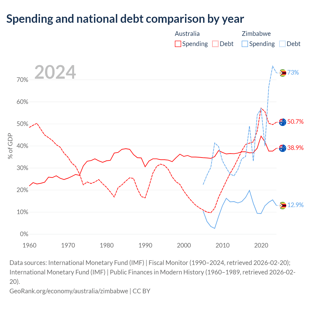 Australia has $891B in government debt (50.7% of GDP), compared to $30.3B (73% of GDP) in Zimbabwe.