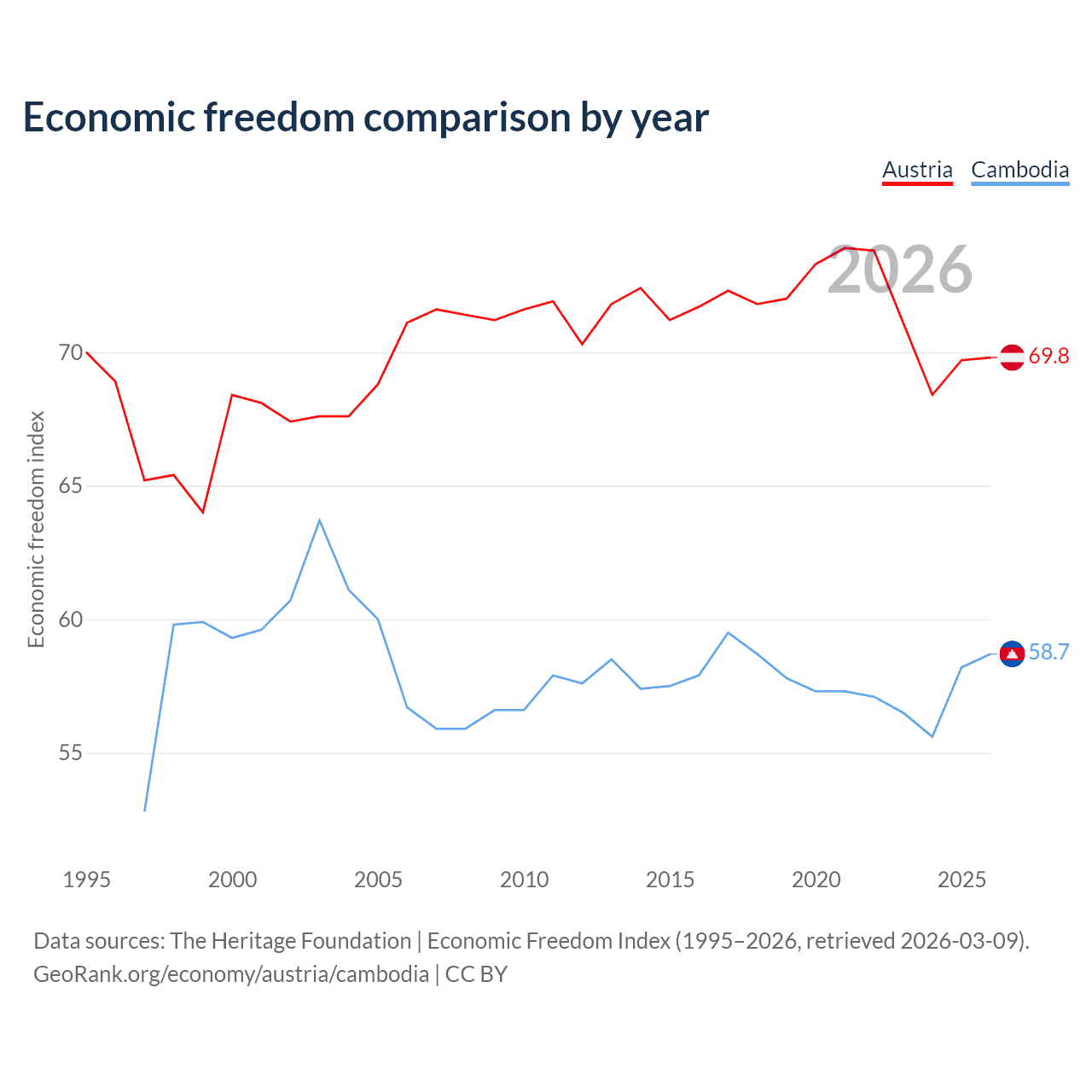 The Economic Freedom Index for Austria is 69.8, ranking 38/197, compared to 58.7 for Cambodia, ranking 108/197. The chart above displays a comparison of annual changes in economic freedom indexes.